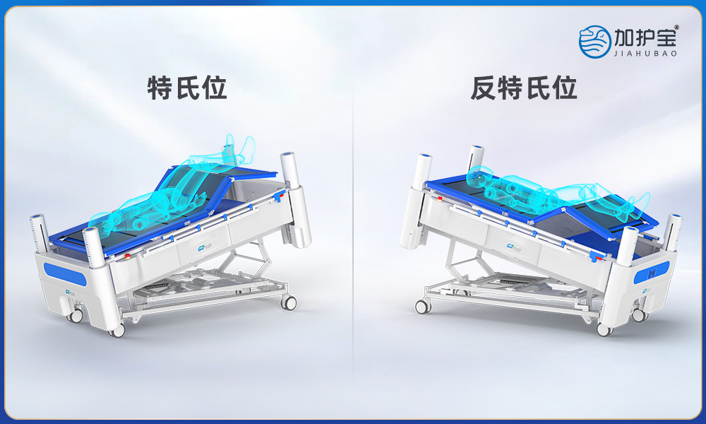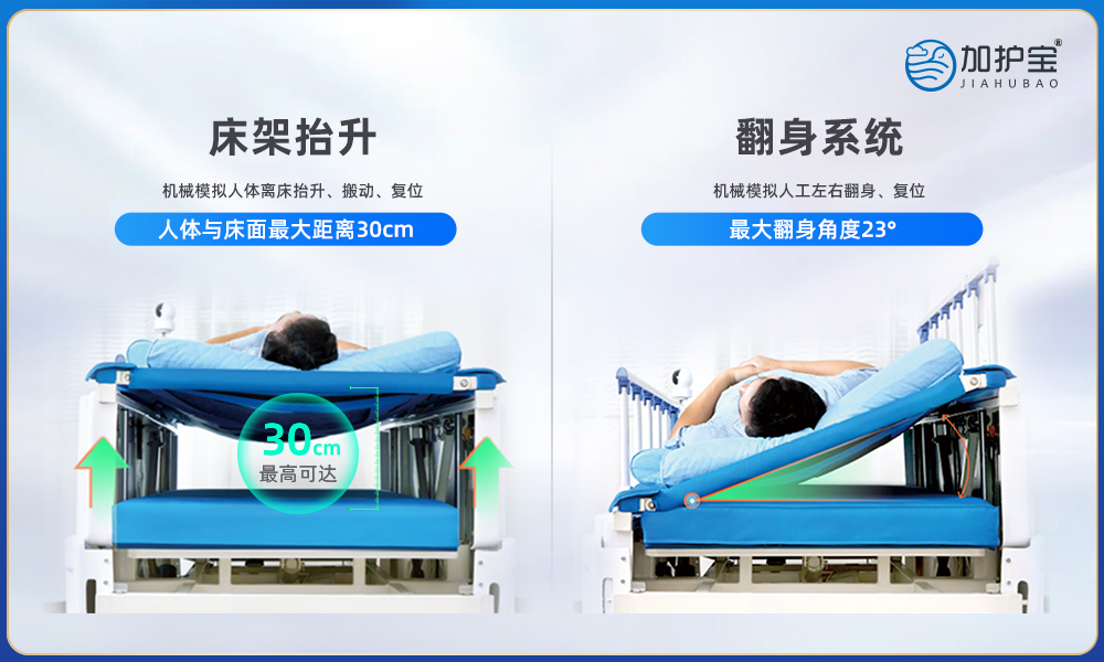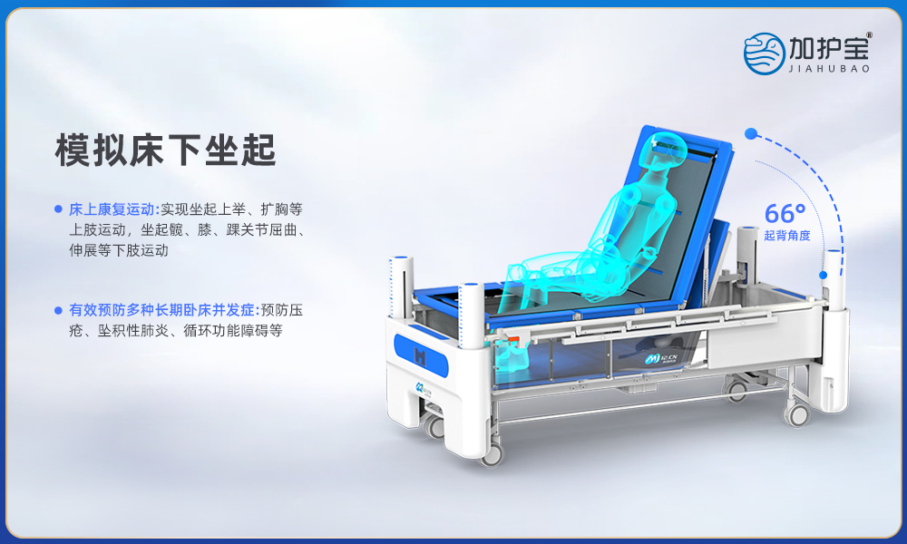 Intelligent rehabilitation nursing bed, designed for long-term bed-ridden people. The original core technology and innovative double-layer bed structure can make it easy to take a shower, bathe, wash hair, foot and perineum, dispose urine and stool, change diaper and simplify daily cleaning and sanitation on bed. The nursing bed has various functions of bed frame lifting, automatic turning, simulating sitting up under the bed, Trendelenburg, Reverse Trendelenburg, etc., users can personalize its position placement and do rehabilitation exercise as needed, thus the nursing bed can effectively prevent and treat bedside complications such as pressure sores, hypostatic pneumonia and circulatory dysfunction. It is the new daily care for people with disabilities because of its precise efficacy, better effect and lower cost.