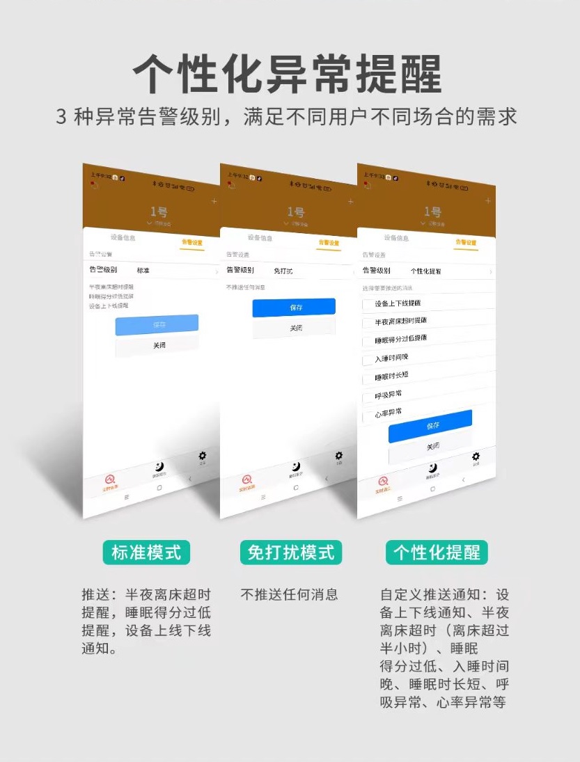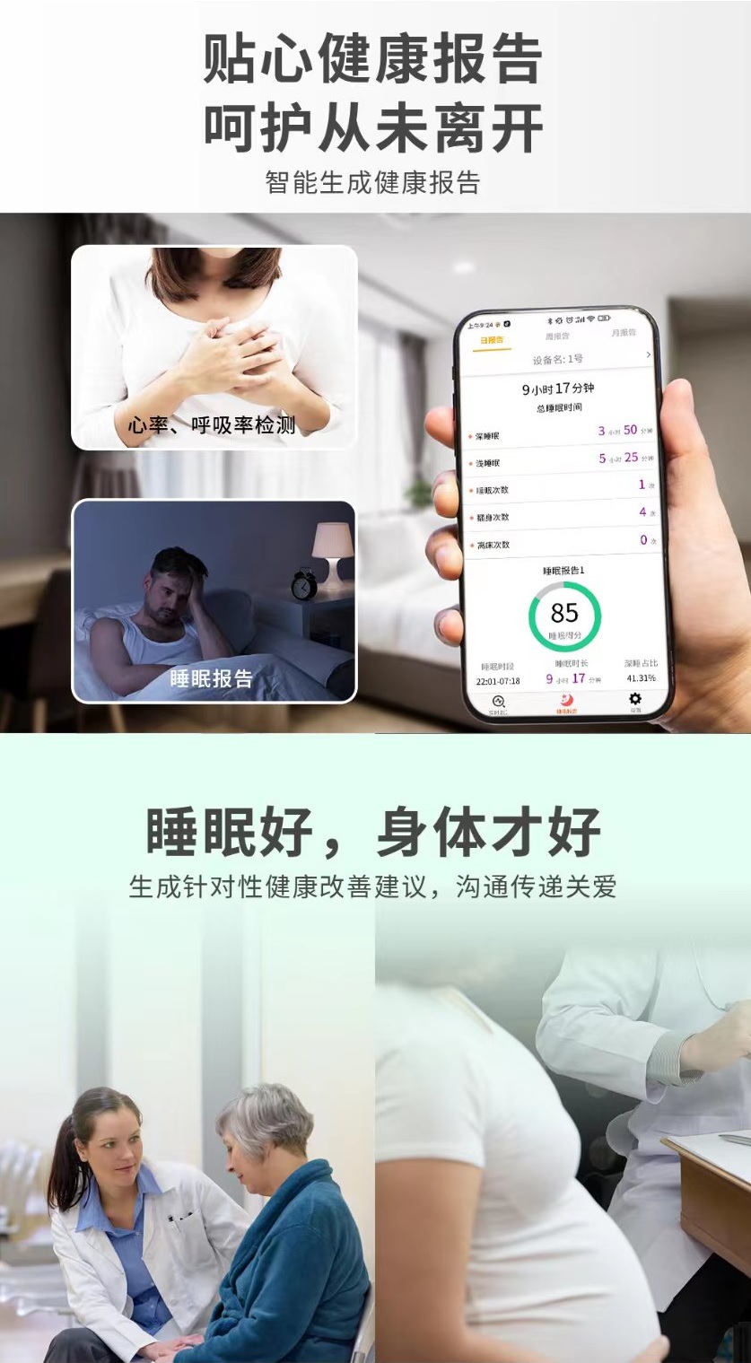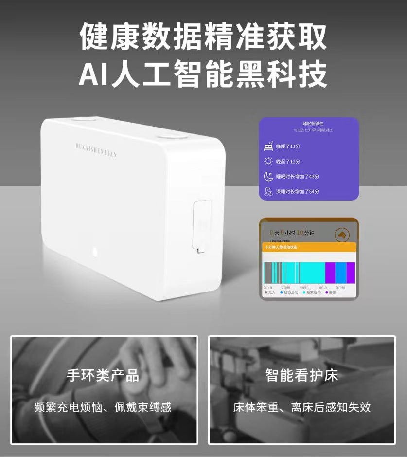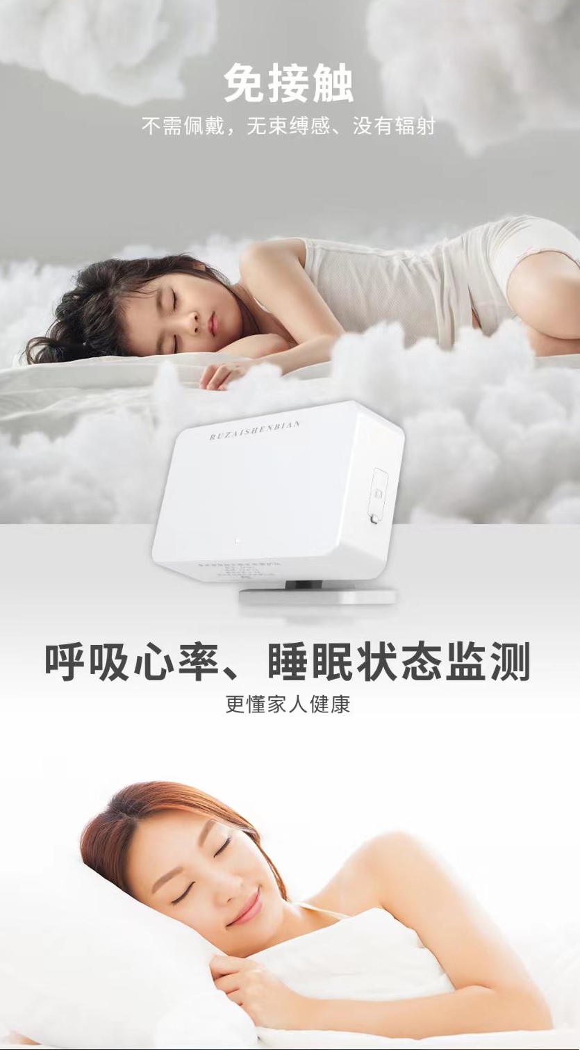 The millimeter wave intelligent sleep recorder is a non-invasive intelligent vital sign monitoring product that can achieve millimeter level detection of peristalsis in the chest and abdomen of the human body. It can monitor breathing, heartbeat, and limb movements of people lying (or sitting). Specifically, it can sense vital sign data of a person lying or sitting in bed, such as position, current state, heart rate, respiratory rate, respiratory waveform, body motion index, etc. This product has the advantages of low cost, 24/7, insensitivity, refined human body state measurement, safety, convenience, high sensitivity, stable performance, strong anti-interference ability, privacy protection, etc.