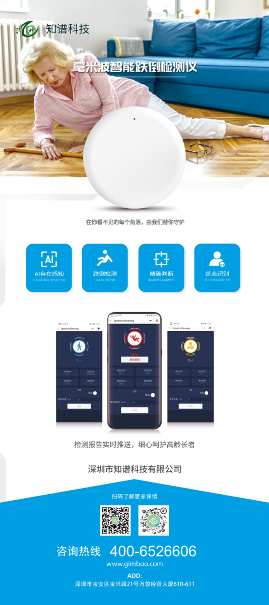 The fall detector can track and identify indoor personnel around 3 meters from the top, with a recognition accuracy of 99.1% and a recognition accuracy of 97.7% for fall activities. It can obtain target information such as personnel's position, speed, posture, and height, and provide non-contact personnel posture detection through accurate point cloud data to achieve fall alarm. The product has the advantages of 24/7, safety, convenience, high sensitivity, stable performance, strong anti-interference ability, privacy protection, and low power consumption. Millimeter wave radar used for fall detection can overcome the adverse effects of light and effectively protect the privacy of monitored objects.