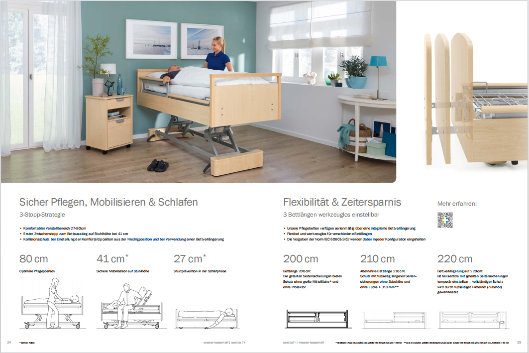 Sentida 7-I Connect Digitalization and the nursing crisis are much-discussed buzzwords - sentida 7-i connect is the answer. sentida 7-i connect provides you with reliable solutions to relieve the load on your nursing staff, such as the new nursing care documentation tool, right at the bed. The input and transfer at the CareBoard® save lots of pieces of paper and back and forth to the PC and therefore helps to save valuable nursing care time of up to 5 minutes per resident. Just like the integrated bed scale, which can save 15 minutes per weighing procedure compared with transfer into a wheelchair and subsequent transport to the scale. The new digital features do not only relieve the burden on nursing care time but also contribute to greater efficiency in your institution. They use the highest safety standards possible and save valuable nursing care time for the benefit of your residents – For human nursing care 4.0.