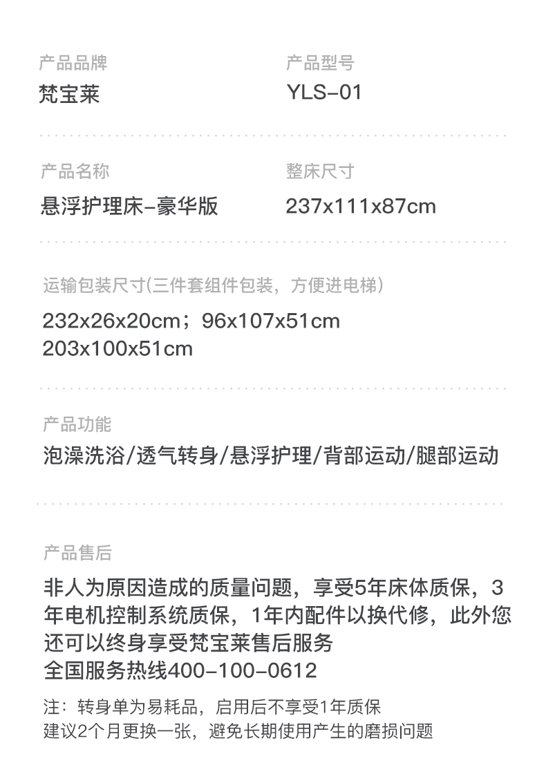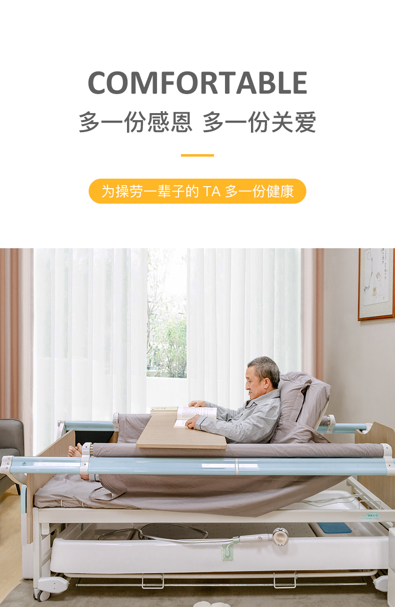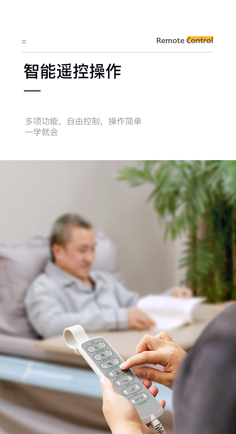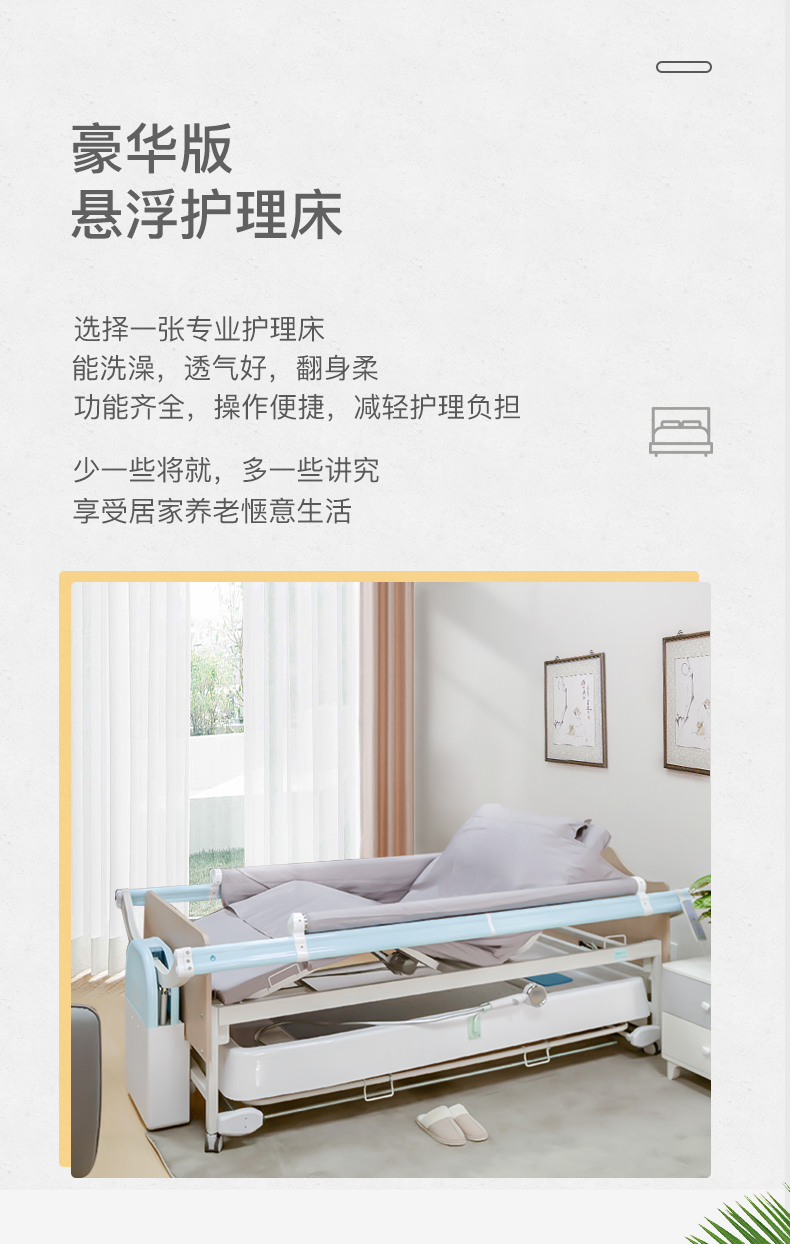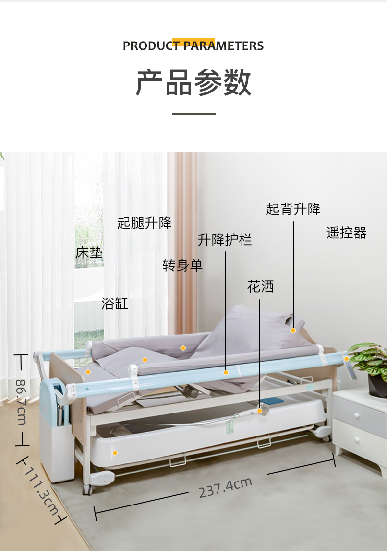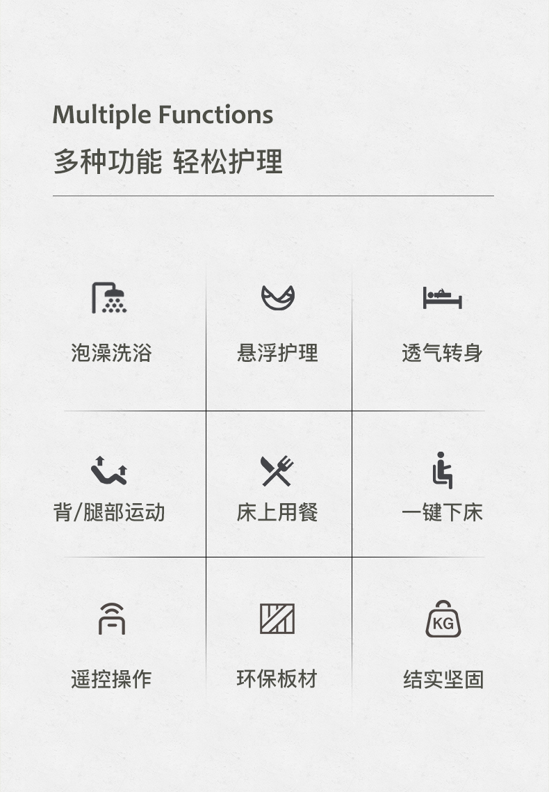 1) Bath function (optional) 2) Flexible Tuming Function 3) Suspended care function 4) Back exercise function 5) Leg Movement Function 6) Back Raising and Leg Lifting Function