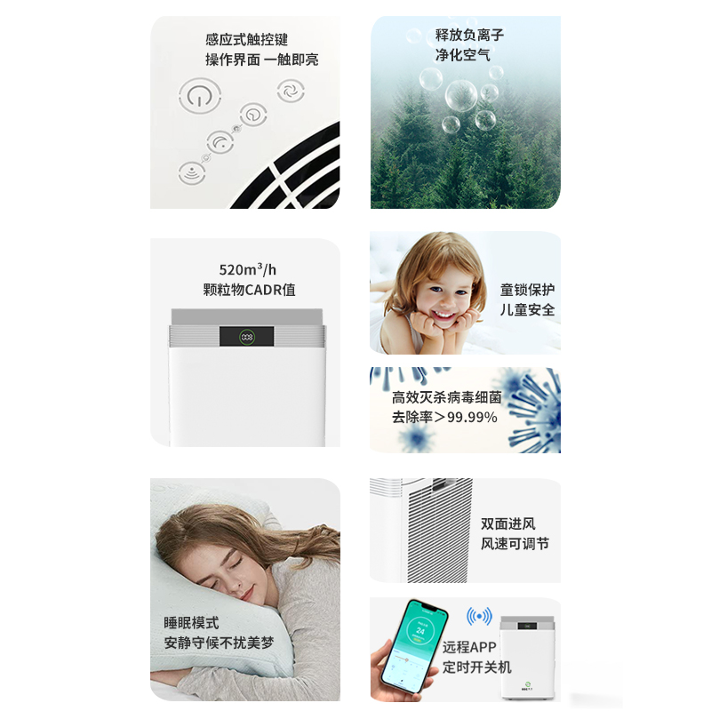 Efficient formaldehyde removal rate of 99%, 30 minute sterilization rate>99.99% Three layer filter with double-sided air intake, professional medical grade air disinfection machine Effectively reduce the incidence of respiratory infectious diseases and cross infections among susceptible populations such as the elderly and children Effectively alleviate respiratory related diseases such as rhinitis, asthma, and chronic pharyngitis. Rapid removal of pathogenic microorganisms, efficient killing of viruses, bacteria, and fungi, high purification efficiency, no secondary pollution, and significant sterilization effect The same purification black technology for the Winter Olympics, with visible strength