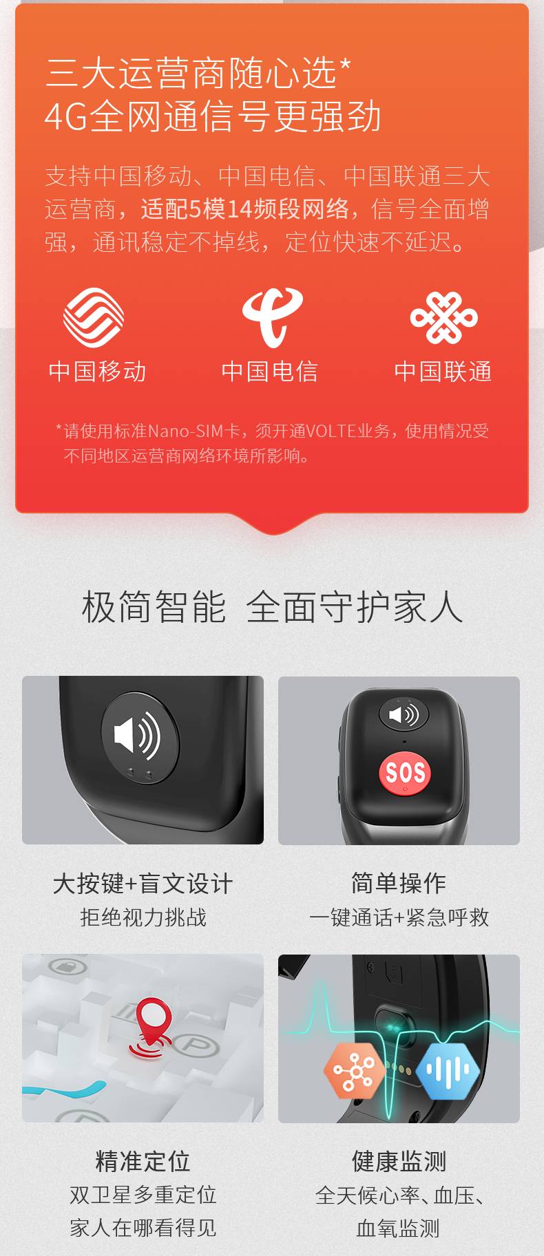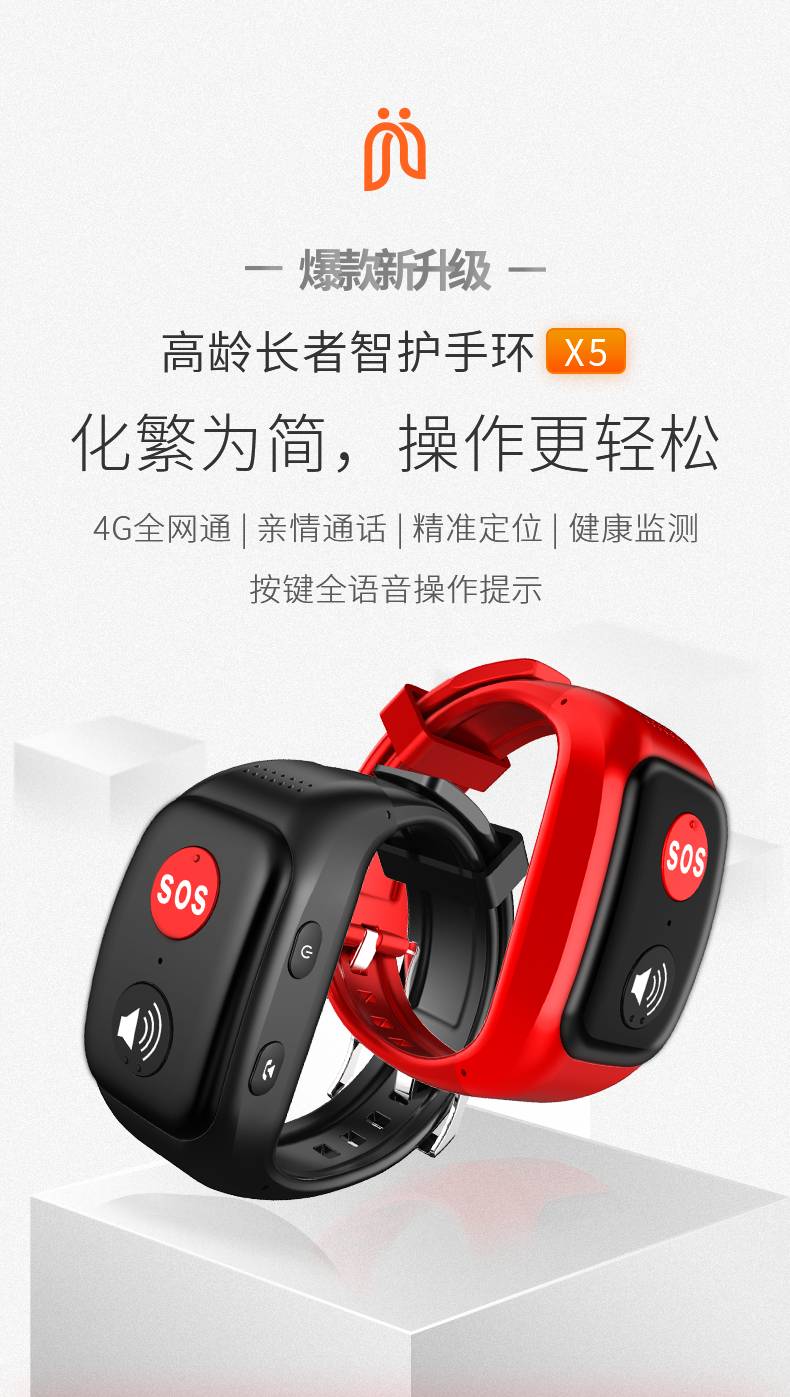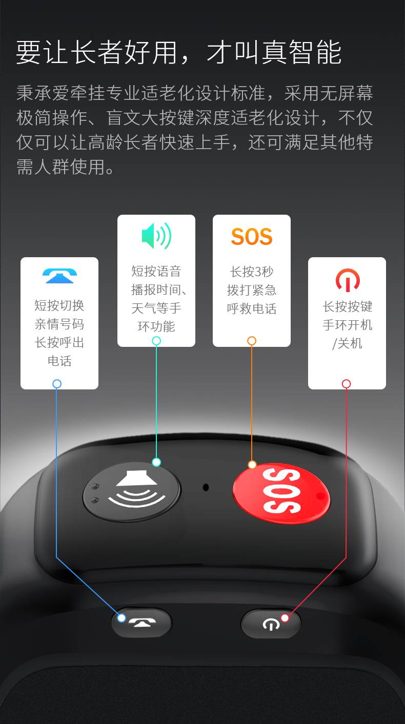 主要面向70歲以上高齡長者及視力障礙的特需人群設(shè)計。 采用無屏幕盲文大按鍵,極簡操作的深度適老化設(shè)計理念。 以4G全網(wǎng)通(CAT.1)作為技術(shù)基底,手環(huán)具備語音通話、定位、健康監(jiān)測、跌倒判定等功能。