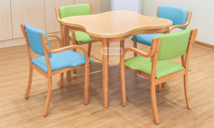 原木日式適老化家具定制,簡(jiǎn)約四葉草實(shí)木桌,養(yǎng)老院圓角餐桌4人飯桌