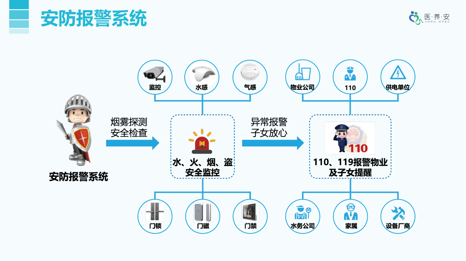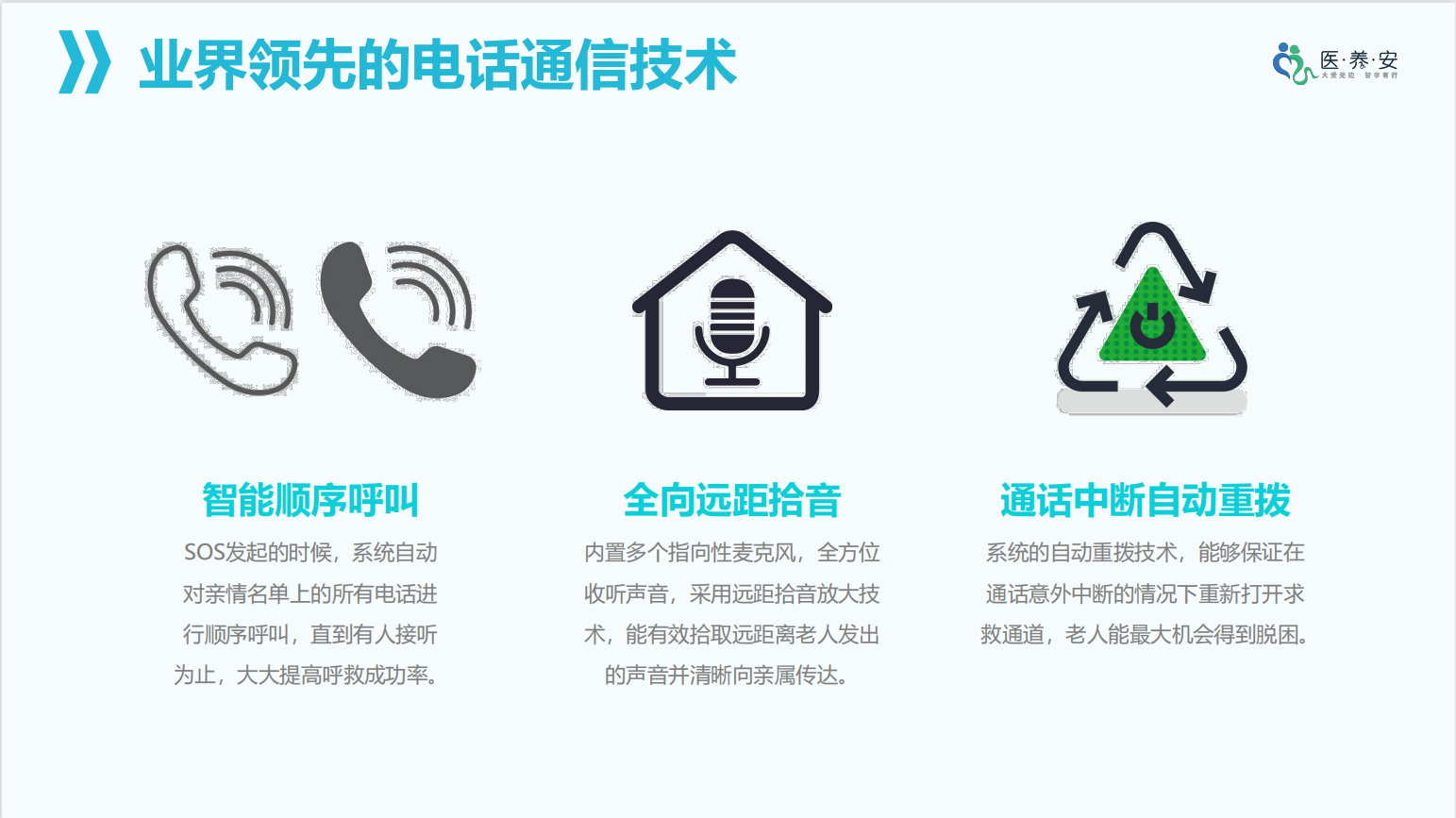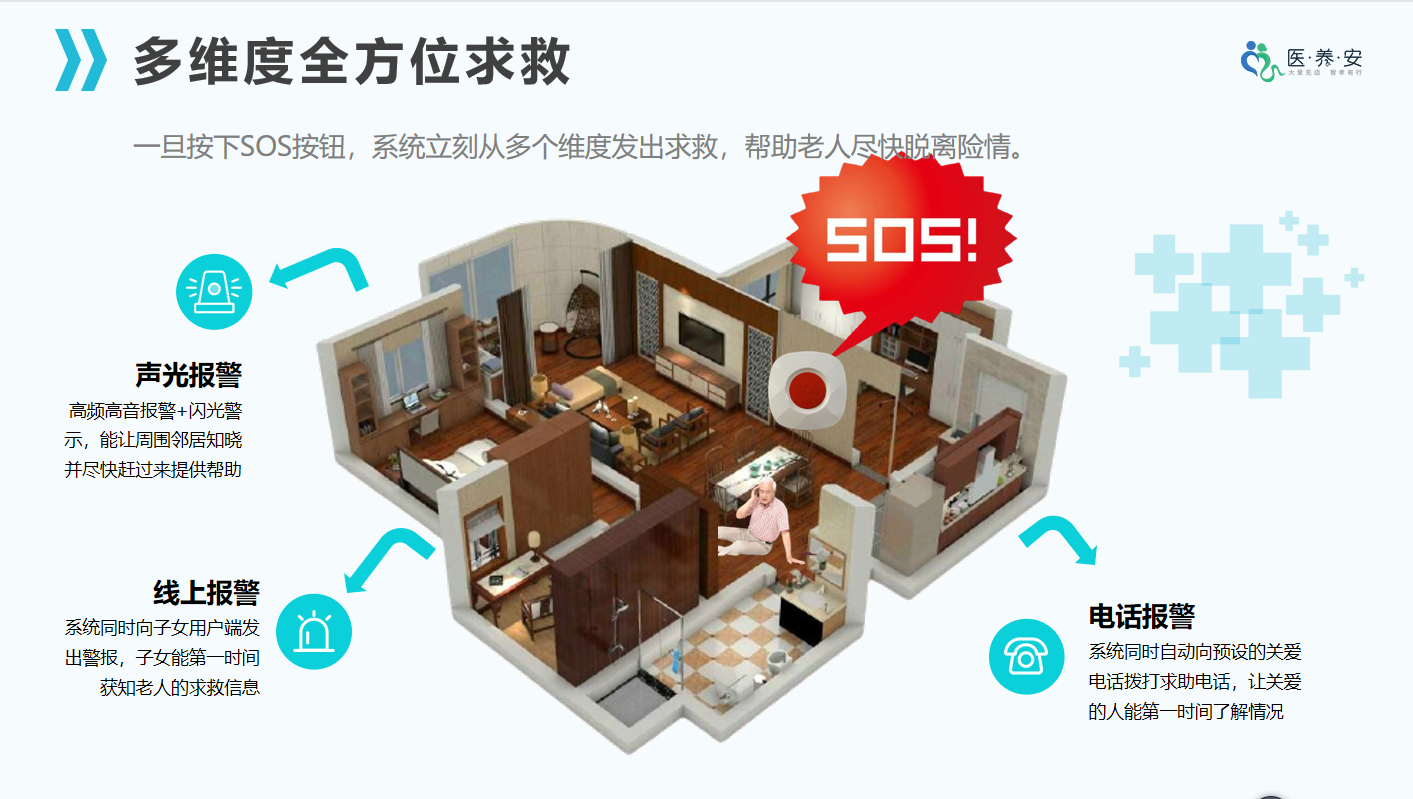 醫(yī)養(yǎng)安緊急呼救SOS是一款專為24小時關(guān)愛而生的愛心產(chǎn)品,具有緊急情況下報警和通話的功能,產(chǎn)品采用超低功耗無線組網(wǎng)設(shè)計(jì),節(jié)能省電而且高穩(wěn)定,抗干擾,防誤報。如遇險情,老人可以使用SOS網(wǎng)關(guān)或者隨身按鈕一鍵緊急呼救,幫助老人爭分奪秒對外及向子女傳遞險情,老人在家可以更放心。報警系統(tǒng)是利用各類功能的探測器對住戶房屋的周邊、空間、環(huán)境及人進(jìn)行整體防護(hù)的系統(tǒng),如果出現(xiàn)異常,立即啟動警鈴,撥打已經(jīng)設(shè)置電話。