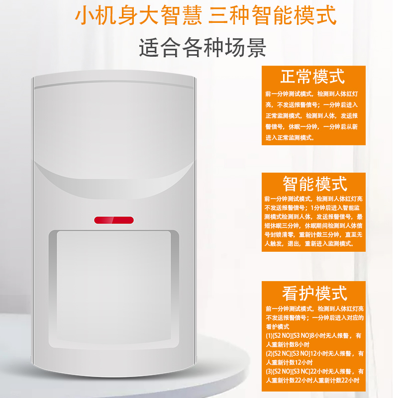 NB-IoT紅外入侵探測(cè)器,具有人體入侵感應(yīng)報(bào)警以及看護(hù)監(jiān)測(cè)(無人報(bào)警)兩種模式; 同時(shí)具備NB-IoT 通信能力,直接與服務(wù)器通信,支持短信、電話、微信公眾號(hào)、平臺(tái)中心等報(bào)警推送;適用于各種需要入侵報(bào)警或做無人檢測(cè)的場(chǎng)景,如養(yǎng)老院、辦公室、店鋪、住宅等。