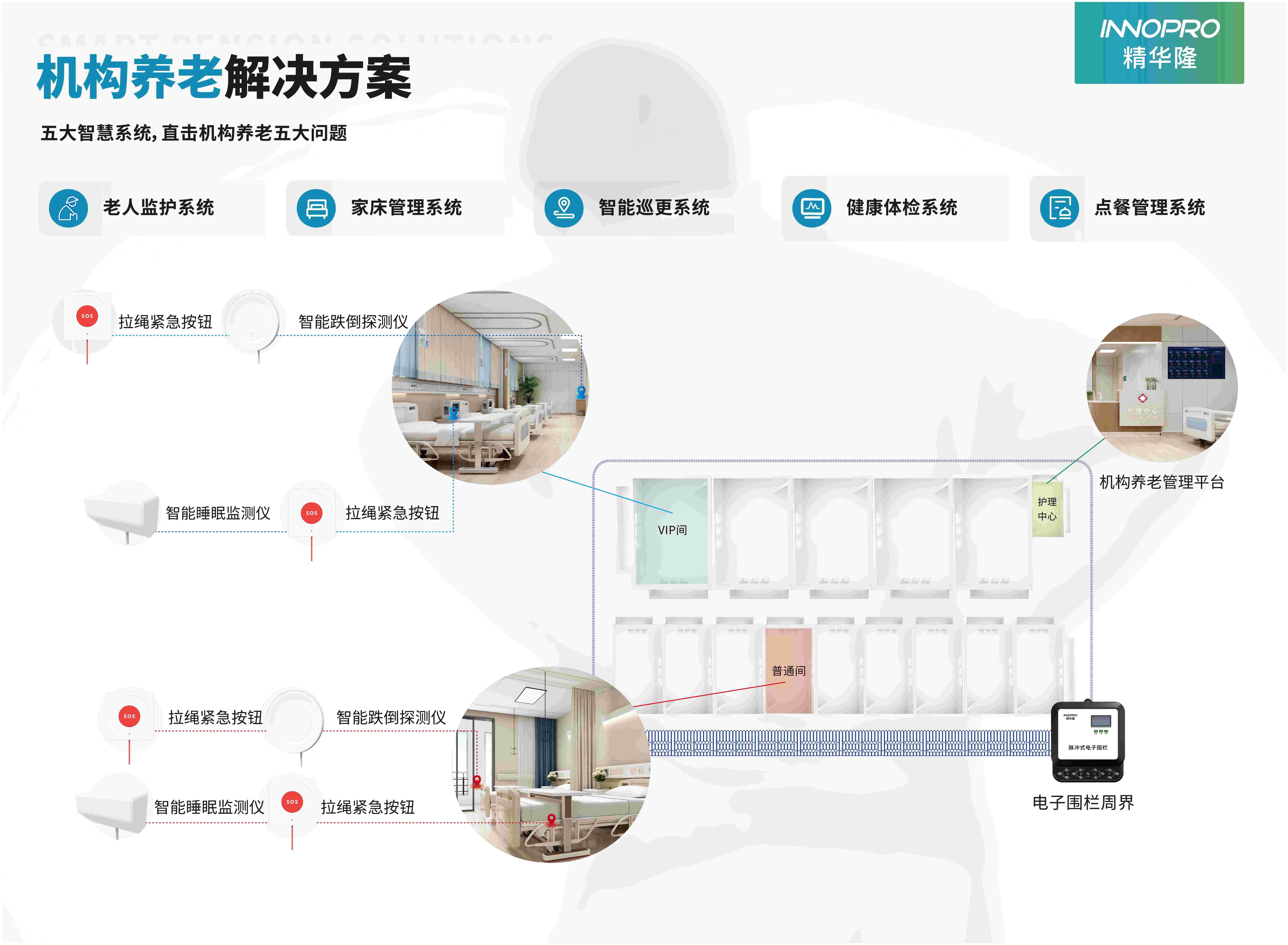 機構智慧養(yǎng)老解決方案,專注為養(yǎng)老機構提供一站式智慧解決方案:精華隆聯(lián)合生態(tài)合作伙伴,提供硬件+軟件+服務一站式解決方案,提供客戶已有業(yè)務平臺數(shù)據(jù)對接定制服務,有效幫助機構智慧化升級,減輕護理人員看護老人的壓力,提高機構管理效率,更好地滿足老人在生活、健康、安全等多方面的需求。