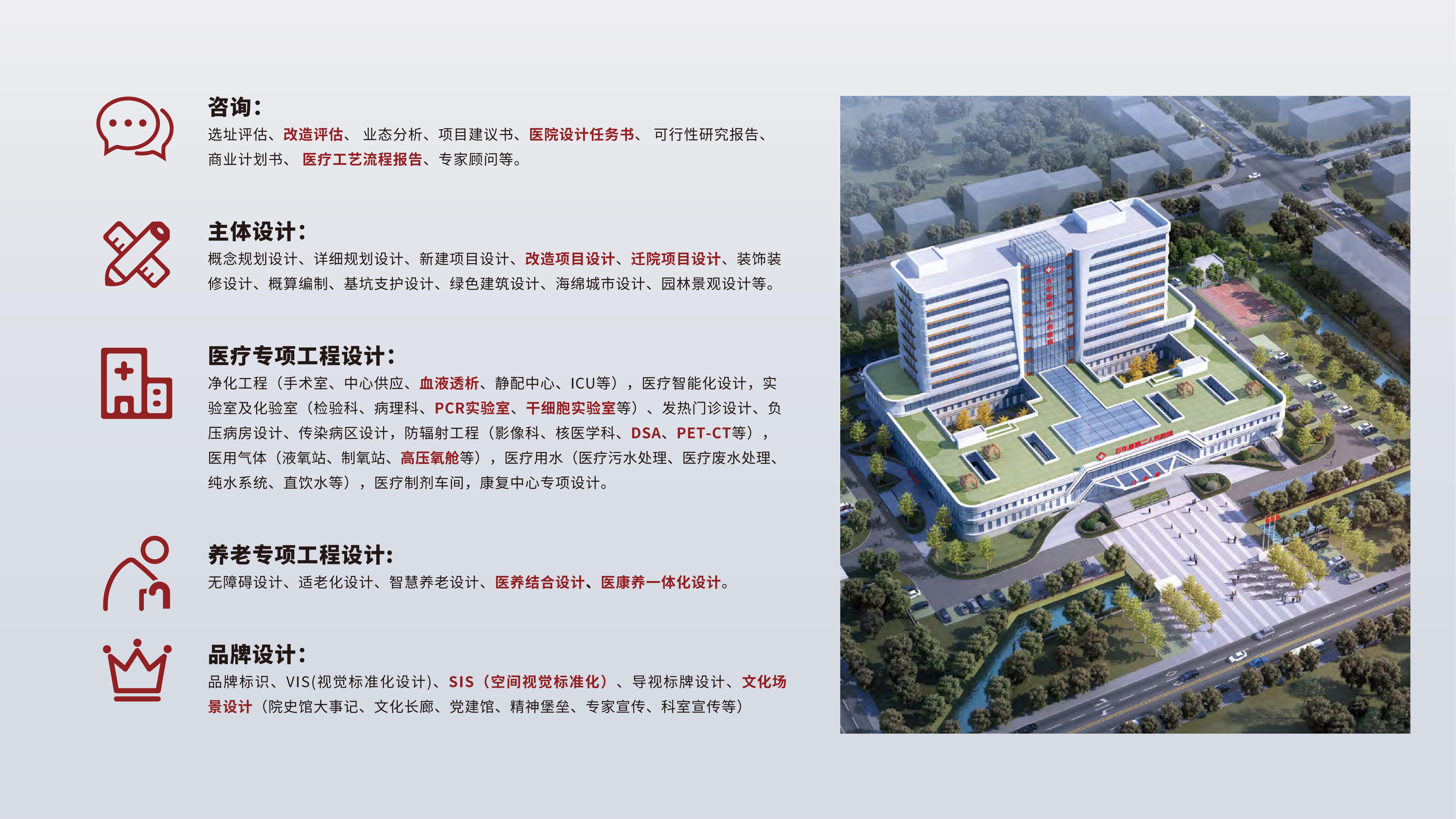 醫(yī)博傳人能為客戶提供從醫(yī)療項(xiàng)目咨詢(項(xiàng)目建議書、可行性研究報(bào)告編制及規(guī)劃方案設(shè)計(jì))、建筑設(shè)計(jì)、室內(nèi)裝飾裝修設(shè)計(jì)、醫(yī)療工藝流程設(shè)計(jì)及品牌文化宣傳設(shè)計(jì)的醫(yī)院建設(shè)全過程一站式服務(wù)