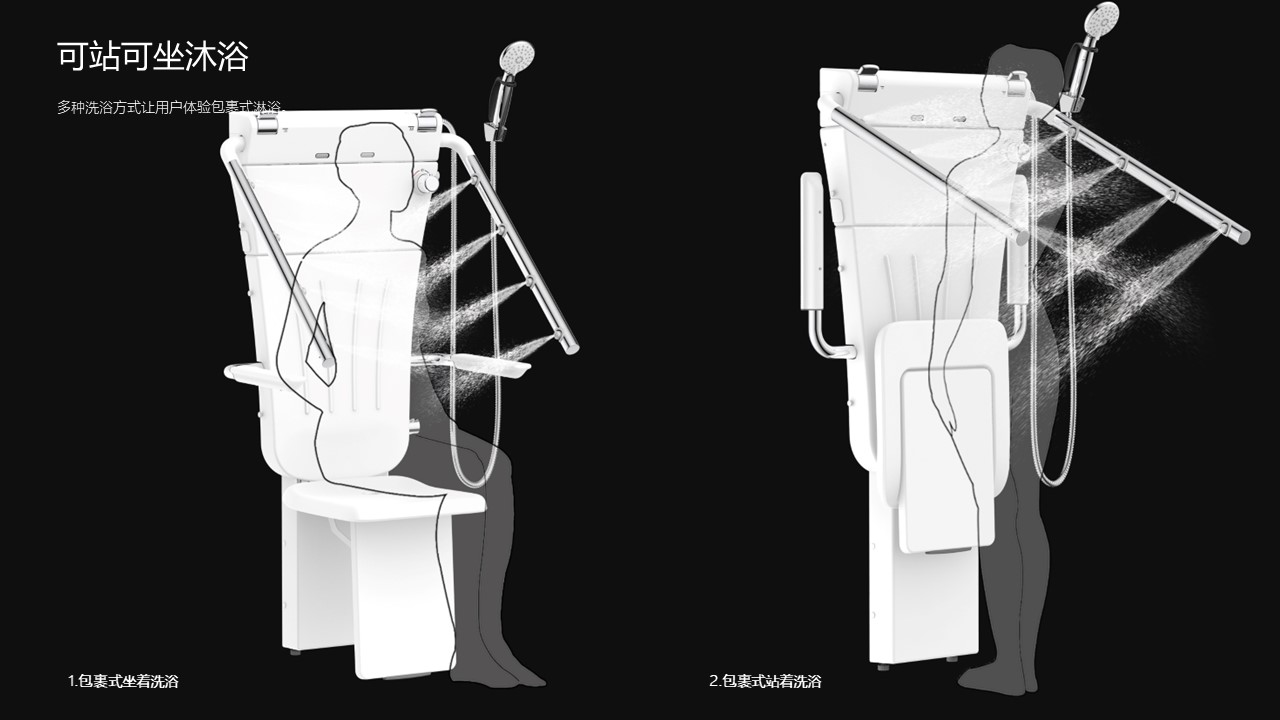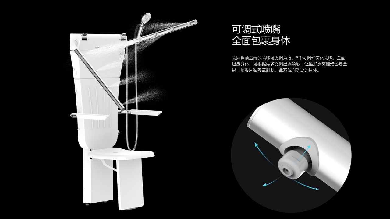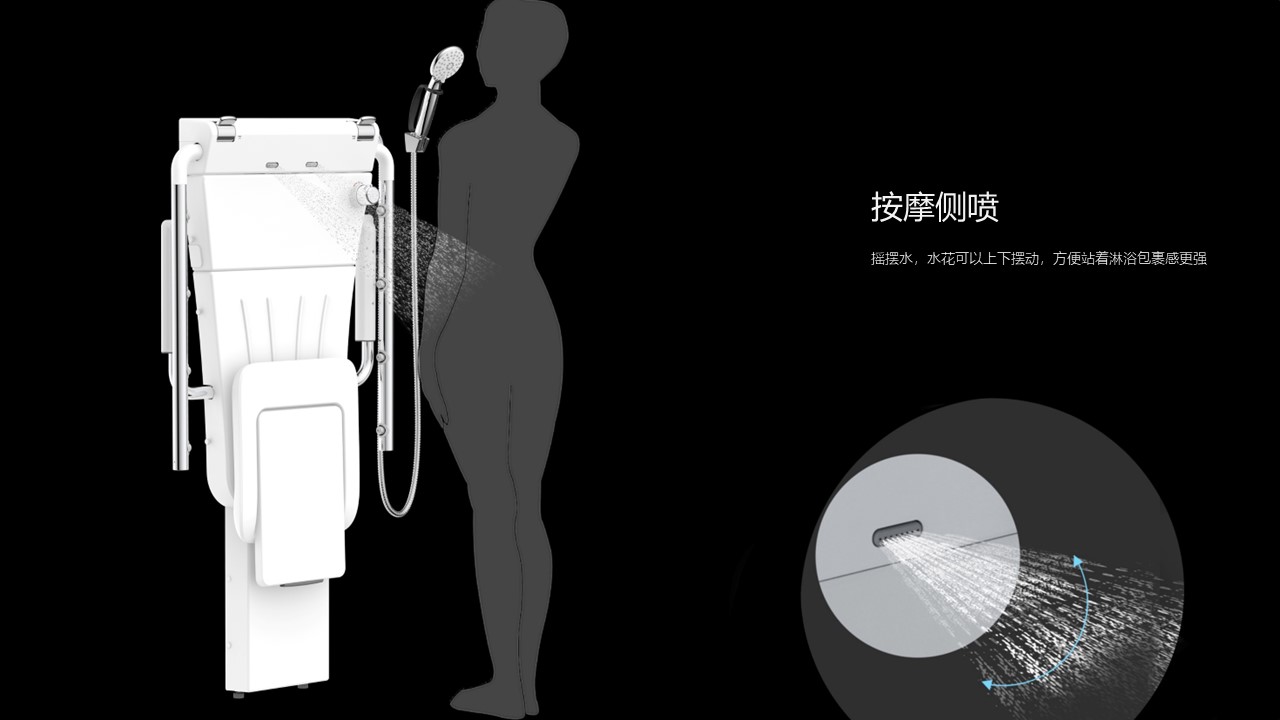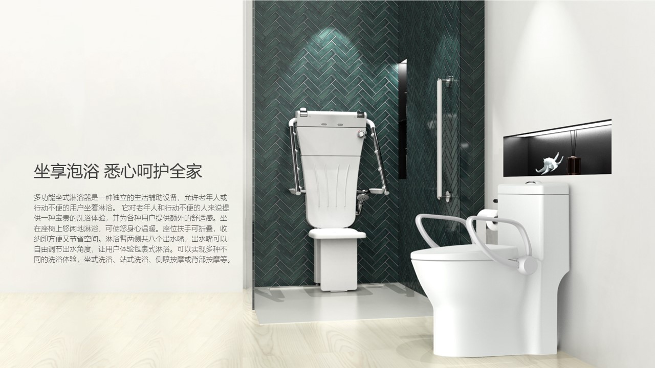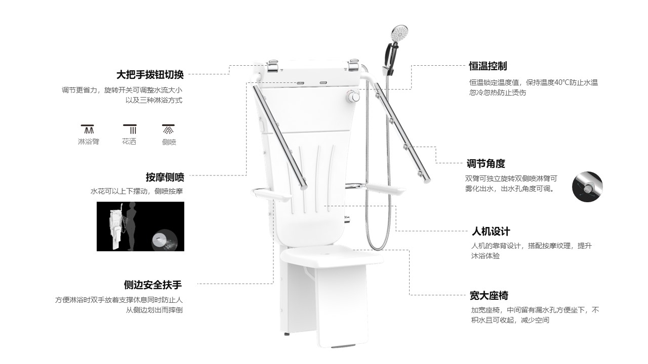 多功能坐式淋浴椅是一種獨(dú)立的生活輔助設(shè)備,允許老年人或行動(dòng)不便的用戶(hù)坐著淋浴。 它對(duì)老年人和行動(dòng)不便的人來(lái)說(shuō)提供一種寶貴的洗浴體驗(yàn),并為各種用戶(hù)提供額外的舒適感。坐在座椅上悠閑地淋浴,可使您身心溫暖。座位扶手可折疊,收納即方便又節(jié)省空間。淋浴臂兩側(cè)共八個(gè)出水嘴,出水嘴可以自由調(diào)節(jié)出水角度,讓用戶(hù)體驗(yàn)包裹式淋浴??梢詫?shí)現(xiàn)多種不同的洗浴體驗(yàn),坐式洗浴、站式洗浴、側(cè)噴按摩或背部按摩等。