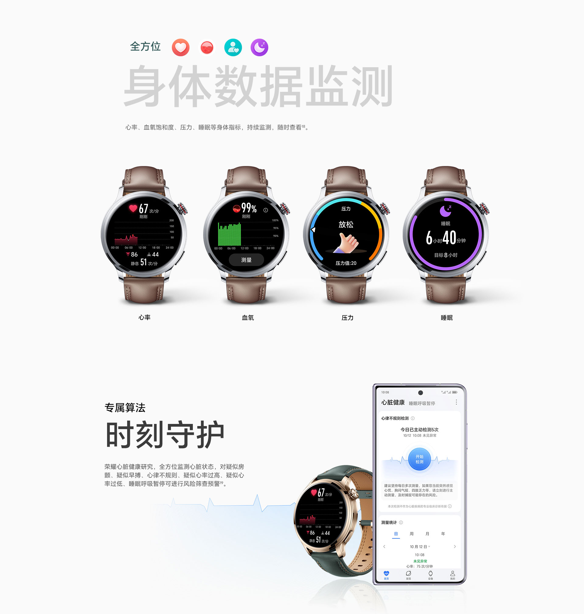 eSIM獨立通話,來電免提,10天超長續(xù)航。無論手機是否在身邊,手表都能隨時在線,不錯過每個電話。 精準(zhǔn)測量每一個健康數(shù)據(jù),全新升級八通道高感光傳感器,大幅提升運動與健康數(shù)據(jù)準(zhǔn)確性。心率、血氧飽和度、壓力、睡眠等身體指標(biāo),持續(xù)監(jiān)測,隨時查看。 專屬算法,時刻守護。榮耀心臟健康研究,全方位監(jiān)測心臟狀態(tài),對疑似房顫、疑似早搏、心律不規(guī)則、疑似心率過高、疑似心率過低、睡眠呼吸暫??蛇M行風(fēng)險篩查預(yù)警。