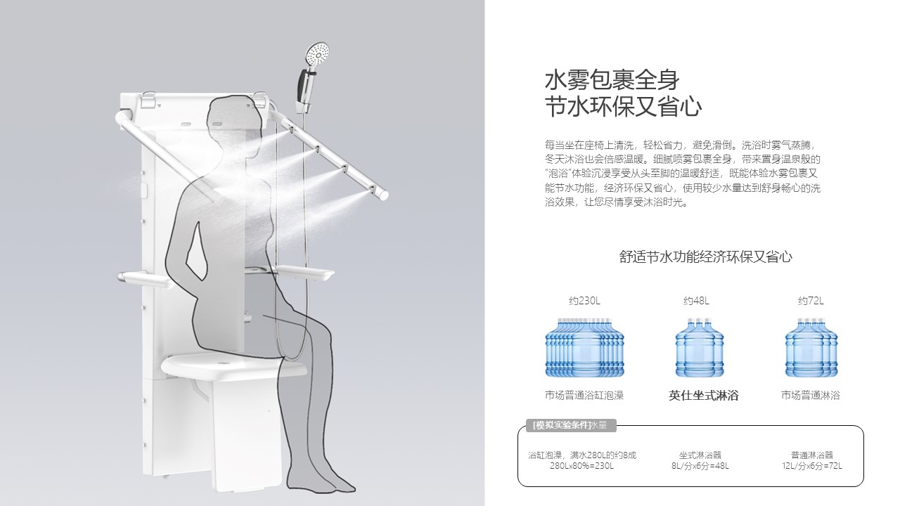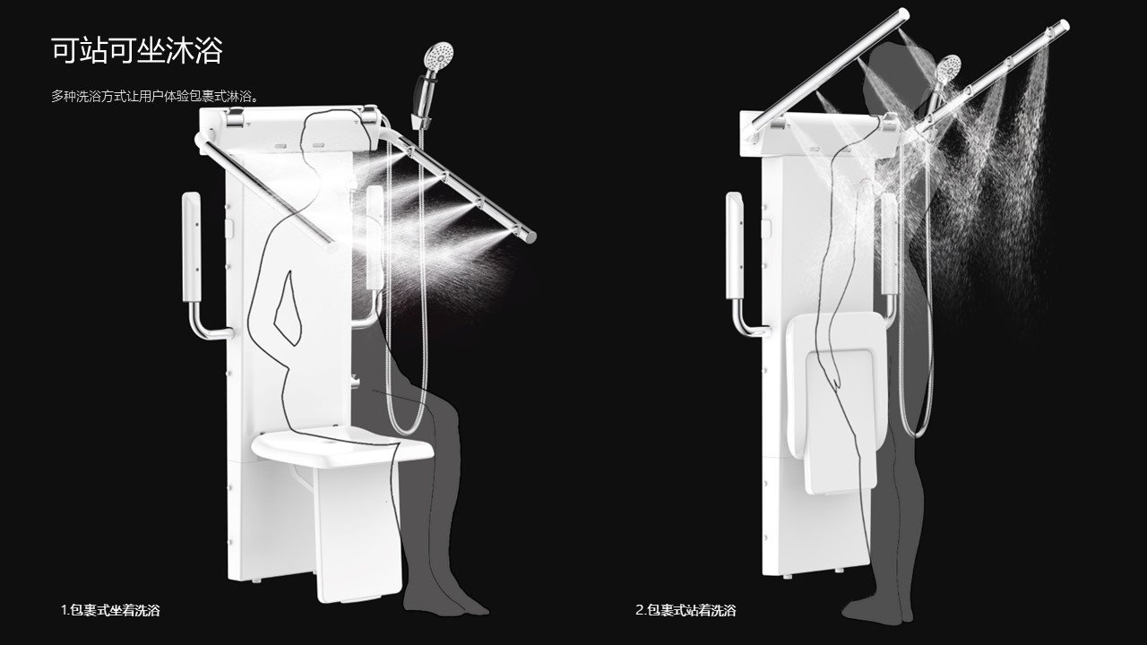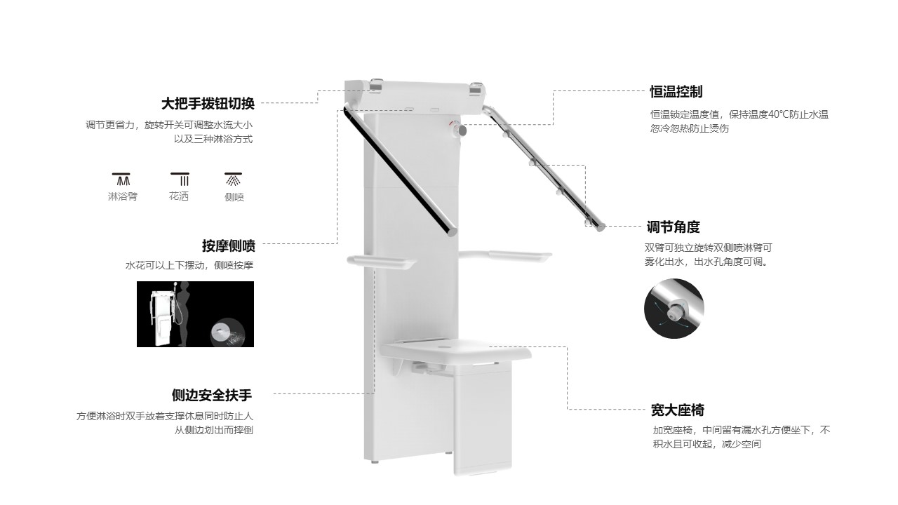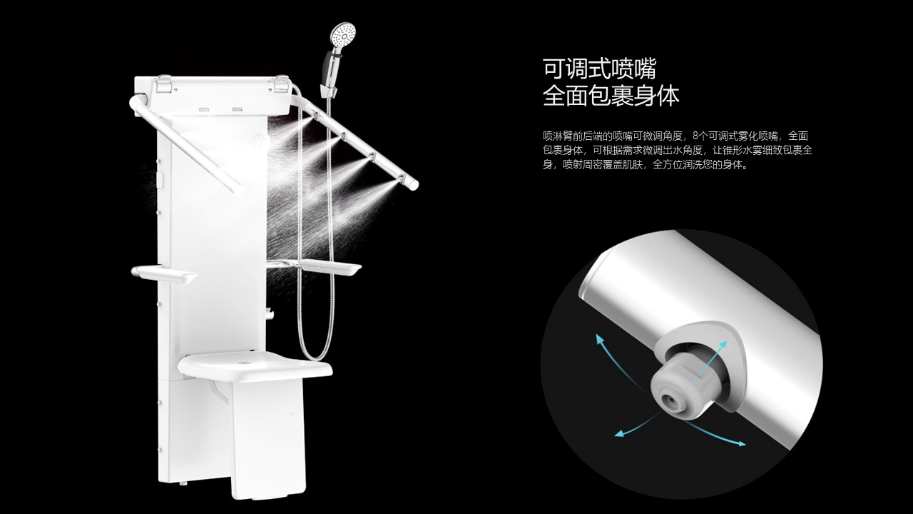 多功能坐式淋浴器是一種獨(dú)立的生活輔助設(shè)備,允許老年人或行動(dòng)不便的用戶(hù)坐著淋浴。 它對(duì)老年人和行動(dòng)不便的人來(lái)說(shuō)提供一種寶貴的洗浴體驗(yàn),并為各種用戶(hù)提供額外的舒適感。坐在座椅上悠閑地淋浴,可使您身心溫暖。座位扶手可折疊,收納即方便又節(jié)省空間。淋浴臂兩側(cè)共八個(gè)出水嘴,出水嘴可以自由調(diào)節(jié)出水角度,讓用戶(hù)體驗(yàn)包裹式淋浴??梢詫?shí)現(xiàn)多種不同的洗浴體驗(yàn),坐式洗浴、站式洗浴、側(cè)噴按摩或背部按摩等