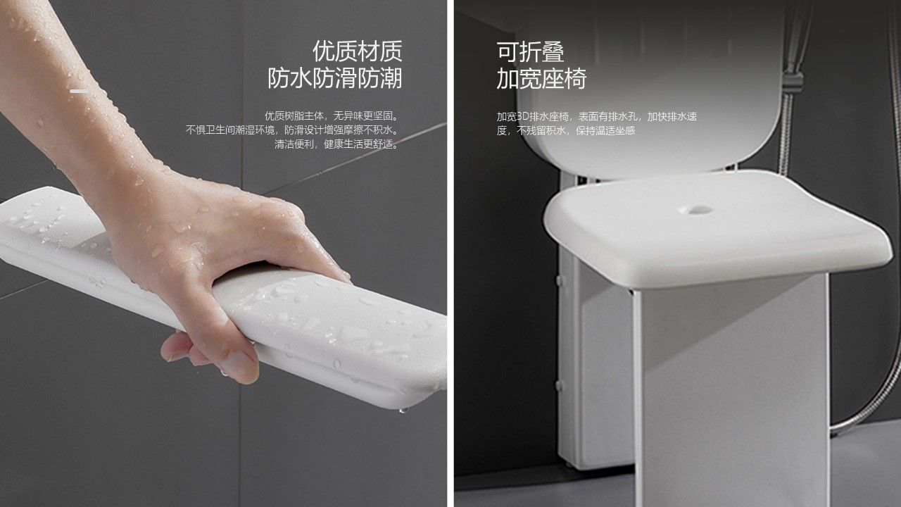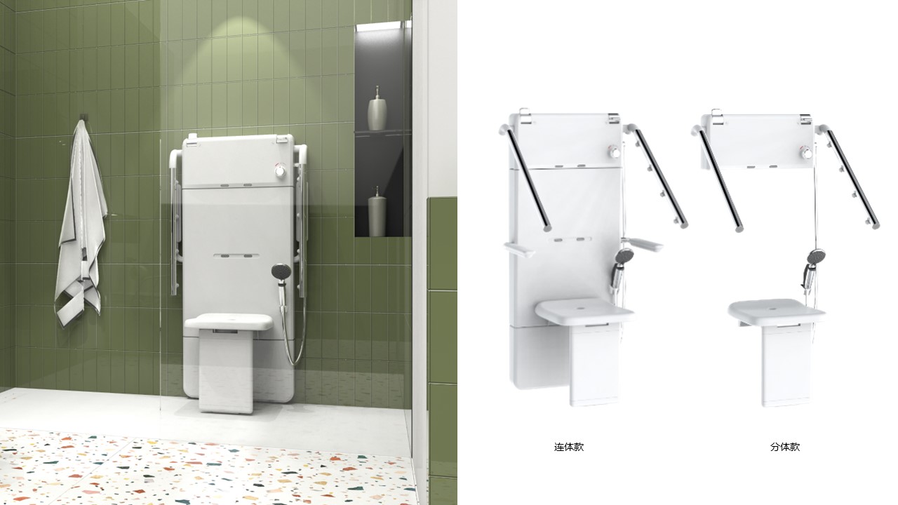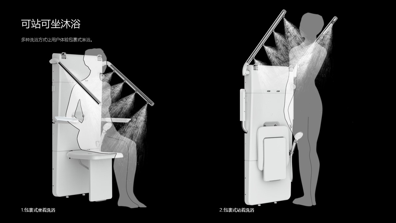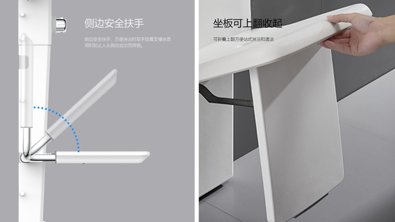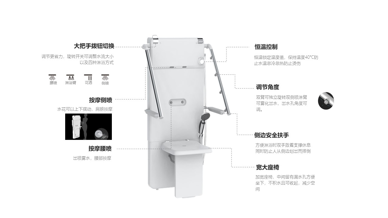 多功能坐式淋浴器是一種獨立的生活輔助設(shè)備,允許老年人或行動不便的用戶坐著淋浴。 它對老年人和行動不便的人來說提供一種寶貴的洗浴體驗,并為各種用戶提供額外的舒適感。坐在座椅上悠閑地淋浴,可使您身心溫暖。座位扶手可折疊,收納即方便又節(jié)省空間。淋浴臂兩側(cè)共八個出水嘴,出水嘴可以自由調(diào)節(jié)出水角度,讓用戶體驗包裹式淋浴??梢詫崿F(xiàn)多種不同的洗浴體驗,坐式洗浴、站式洗浴、側(cè)噴按摩或背部按摩等。