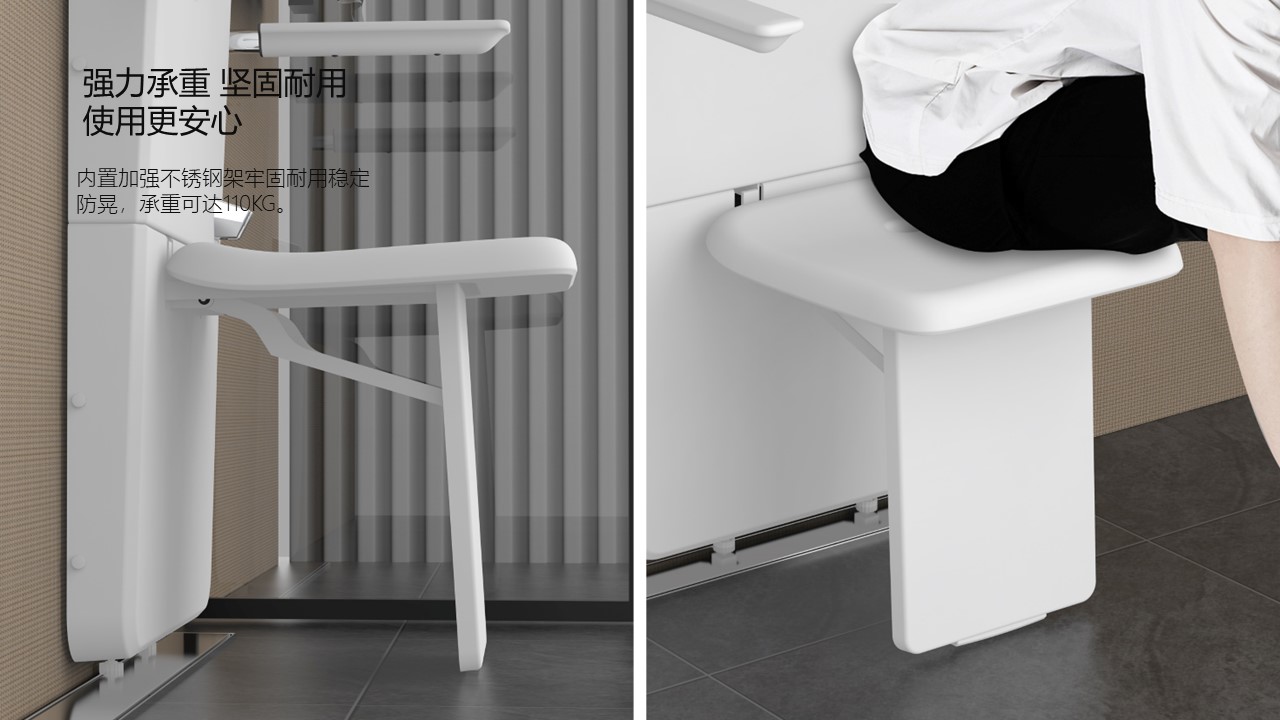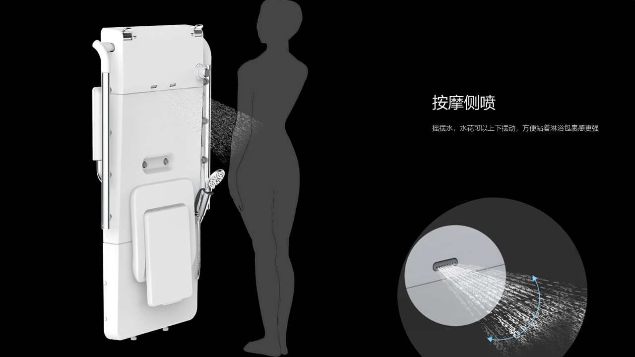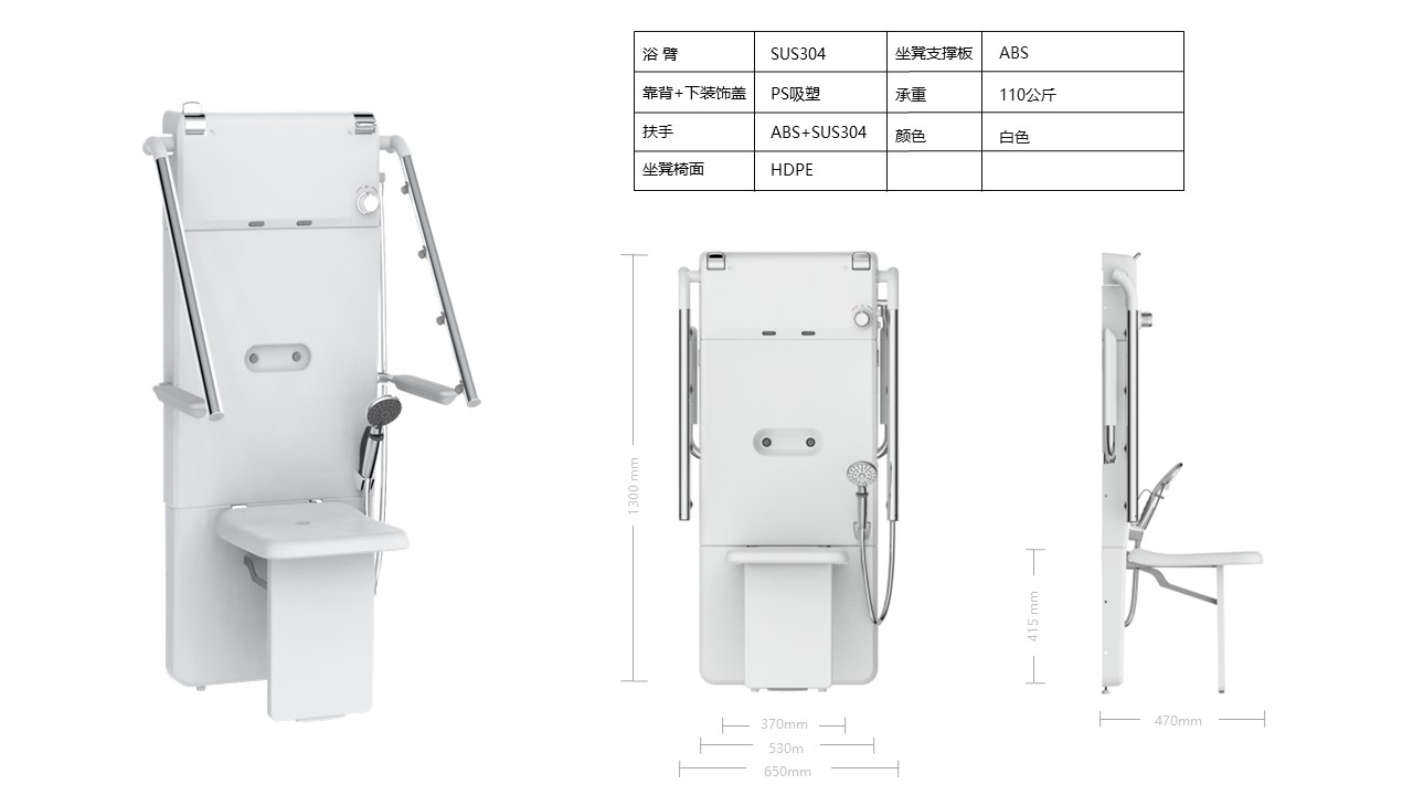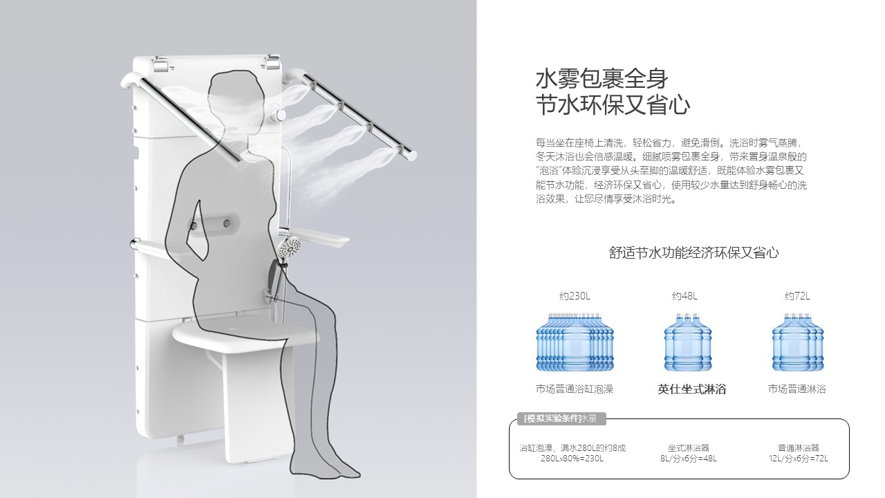 多功能坐式淋浴器是一種獨立的生活輔助設(shè)備,允許老年人或行動不便的用戶坐著淋浴。 它對老年人和行動不便的人來說提供一種寶貴的洗浴體驗,并為各種用戶提供額外的舒適感。坐在座椅上悠閑地淋浴,可使您身心溫暖。座位扶手可折疊,收納即方便又節(jié)省空間。淋浴臂兩側(cè)共八個出水嘴,出水嘴可以自由調(diào)節(jié)出水角度,讓用戶體驗包裹式淋浴??梢詫崿F(xiàn)多種不同的洗浴體驗,坐式洗浴、站式洗浴、側(cè)噴按摩或背部按摩等。