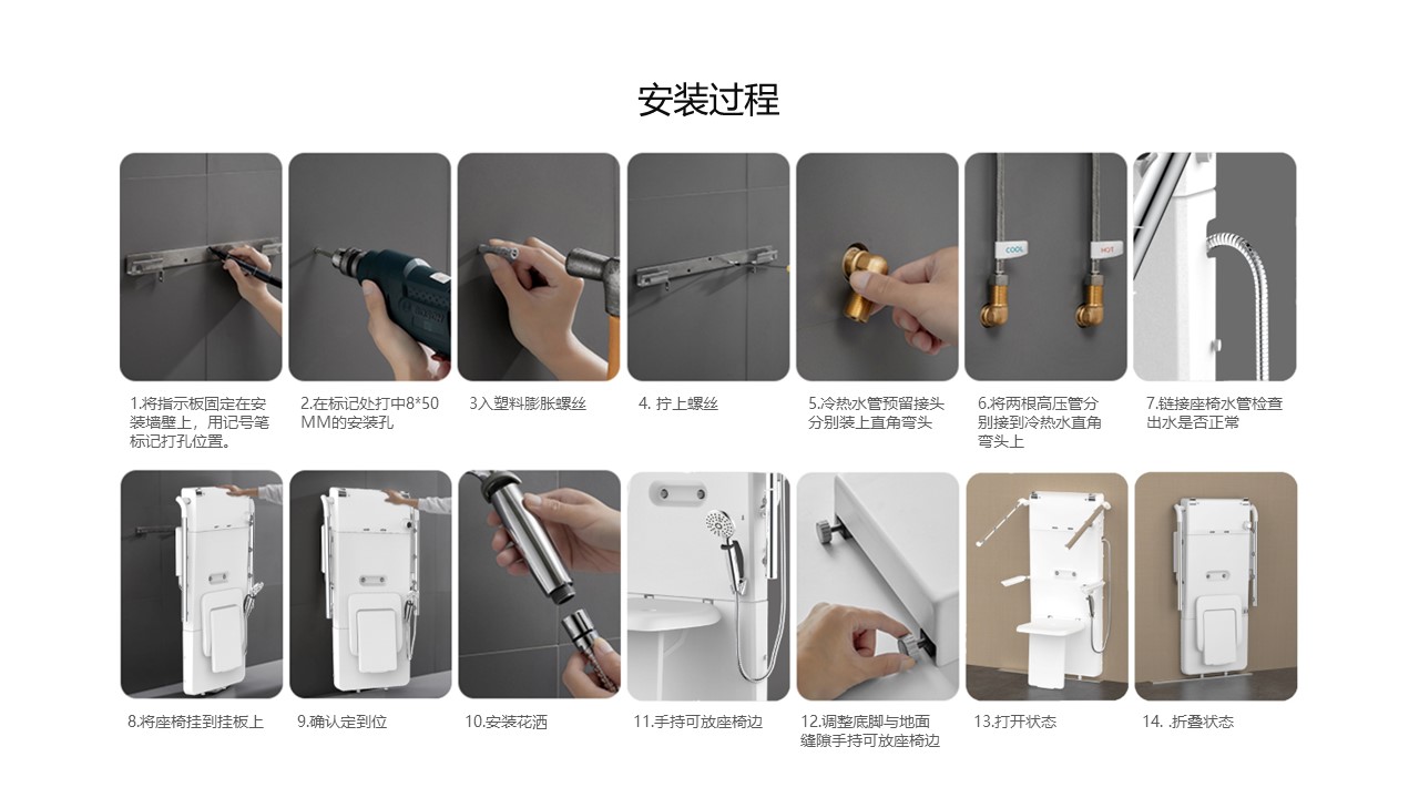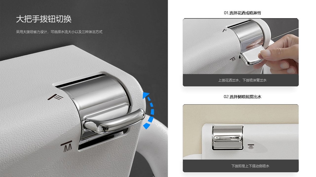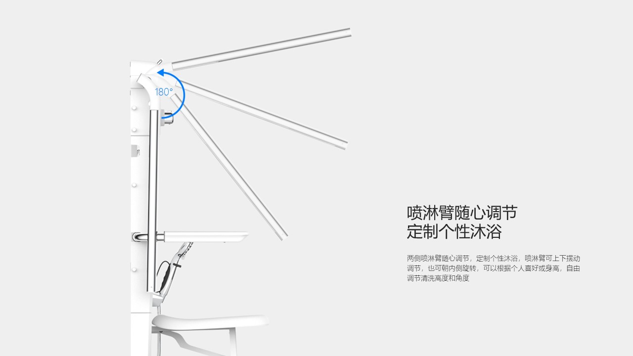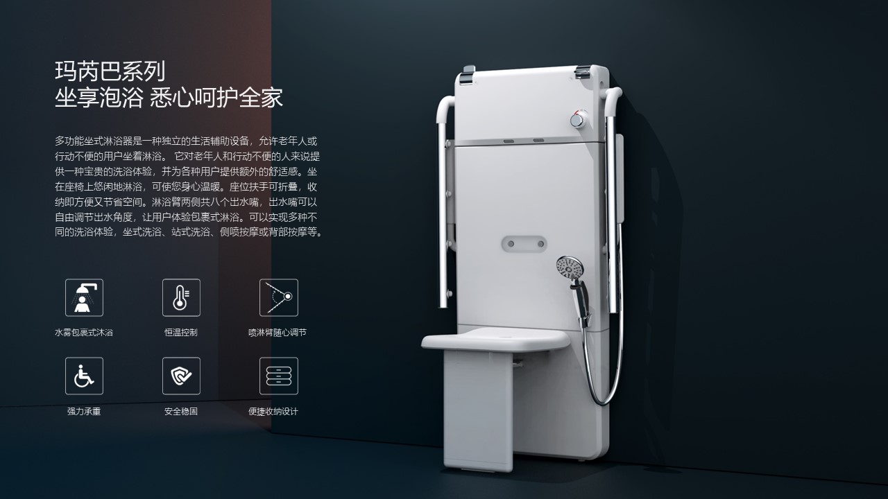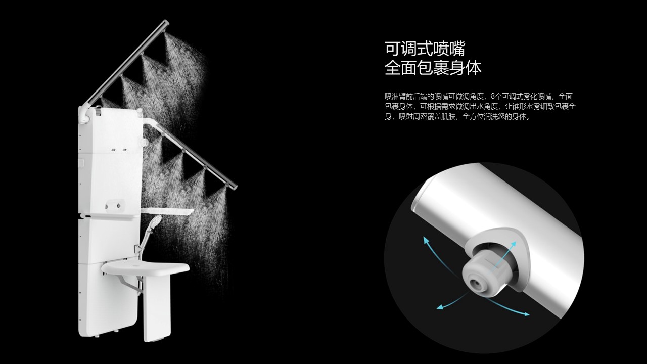多功能坐式淋浴器是一種獨立的生活輔助設(shè)備,允許老年人或行動不便的用戶坐著淋浴。 它對老年人和行動不便的人來說提供一種寶貴的洗浴體驗,并為各種用戶提供額外的舒適感。坐在座椅上悠閑地淋浴,可使您身心溫暖。座位扶手可折疊,收納即方便又節(jié)省空間。淋浴臂兩側(cè)共八個出水嘴,出水嘴可以自由調(diào)節(jié)出水角度,讓用戶體驗包裹式淋浴??梢詫崿F(xiàn)多種不同的洗浴體驗,坐式洗浴、站式洗浴、側(cè)噴按摩或背部按摩等。