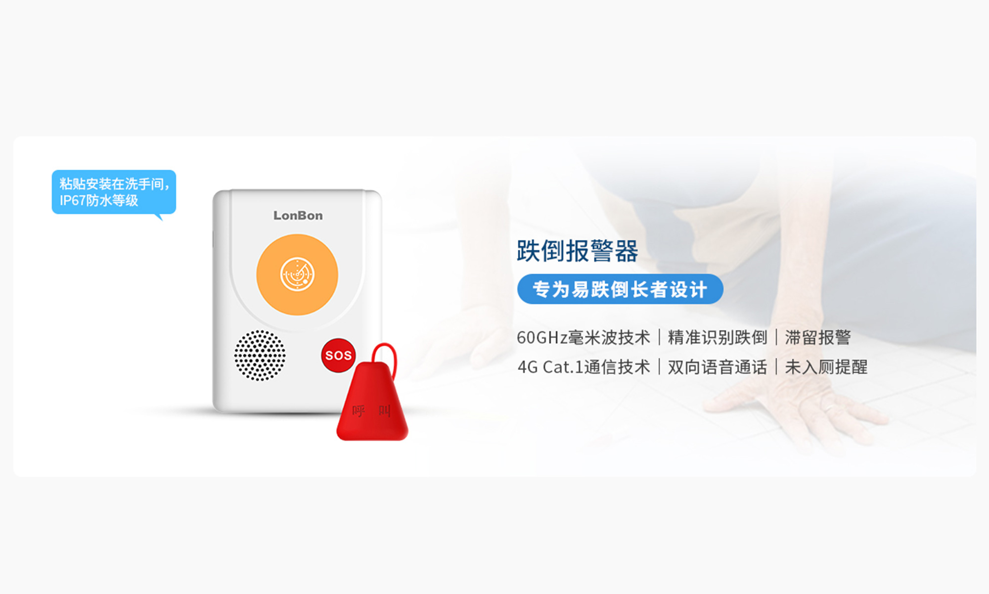 跌倒報警器: 專為易跌倒老人設(shè)計,粘貼安裝在洗手間,IP67防水等級 60GHz毫米波技術(shù)、精準(zhǔn)識別跌倒、4G Cat.1通信技術(shù)、滯留報警、雙向語音通話、未入廁提醒