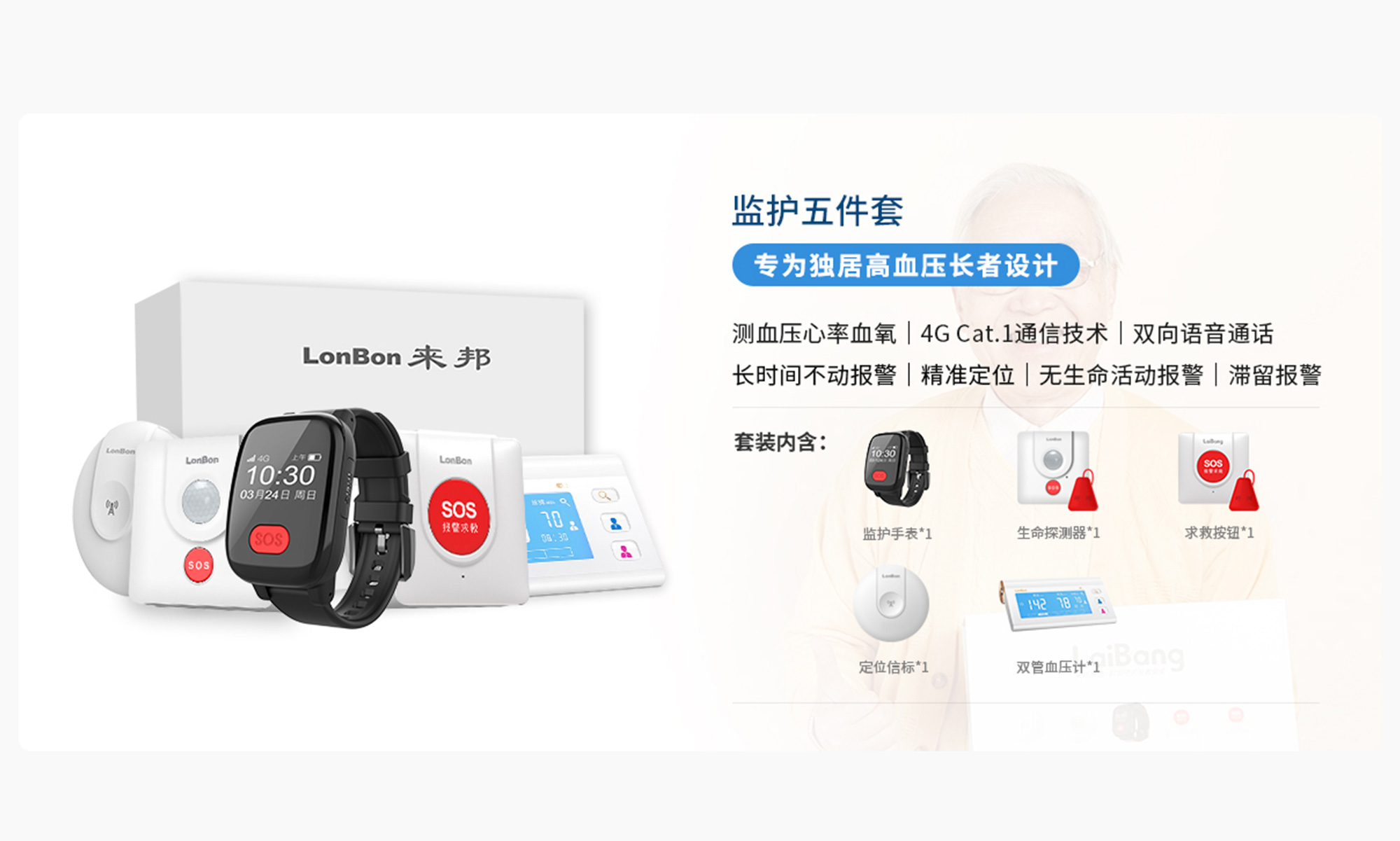 監(jiān)護五件套: 專為獨居高血壓老人設(shè)計 測血壓心率血氧、4G Cat.1通信技術(shù)、雙向語音通話、精準定位、長時間不動報警、無生命活動報警、滯留報警 包含:監(jiān)護手表+血壓計+生命探測器+報警按鈕+定位信標
