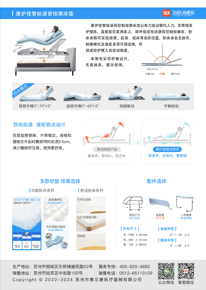 1、軟墊采用2CM記憶海綿+4CM純聚氨酯海綿。 2、床架具有背腿升降功能,背部折轉(zhuǎn)度約0-70度,腿部折轉(zhuǎn)度約0-40度。雙后退滾輪鉸點(diǎn)設(shè)計,有5.5cm后退空間,背板和腿板在升降過程中自動后退5.5cm,減少背部和腿部擠壓感。 振動按摩區(qū)域按摩 多種強(qiáng)度舒筋解疲,四種按摩模式和三種按摩強(qiáng)度可選??梢灾形恼Z音離線操作控制升降和按摩。