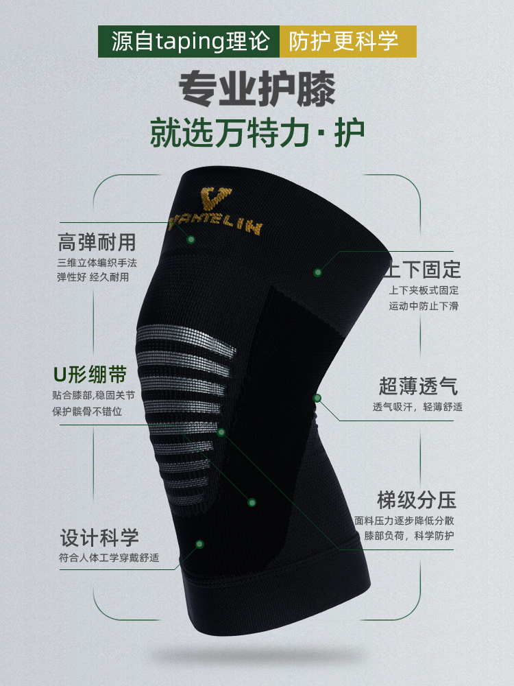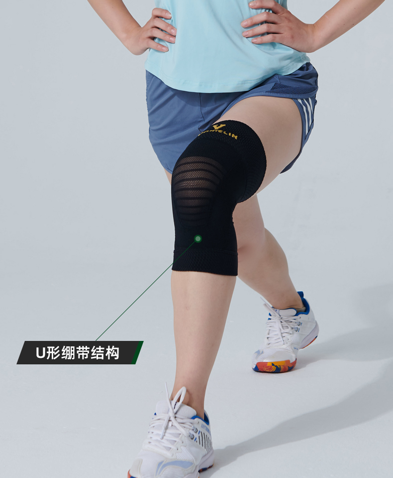 U型繃帶結(jié)構(gòu),緊緊包裹膝部,抑制膝關(guān)節(jié)過度發(fā)力造成不適、 上下固定結(jié)構(gòu),高彈防滑,不易上下滑動、 特殊的針織結(jié)構(gòu),高彈透氣,不會妨礙膝部運動。