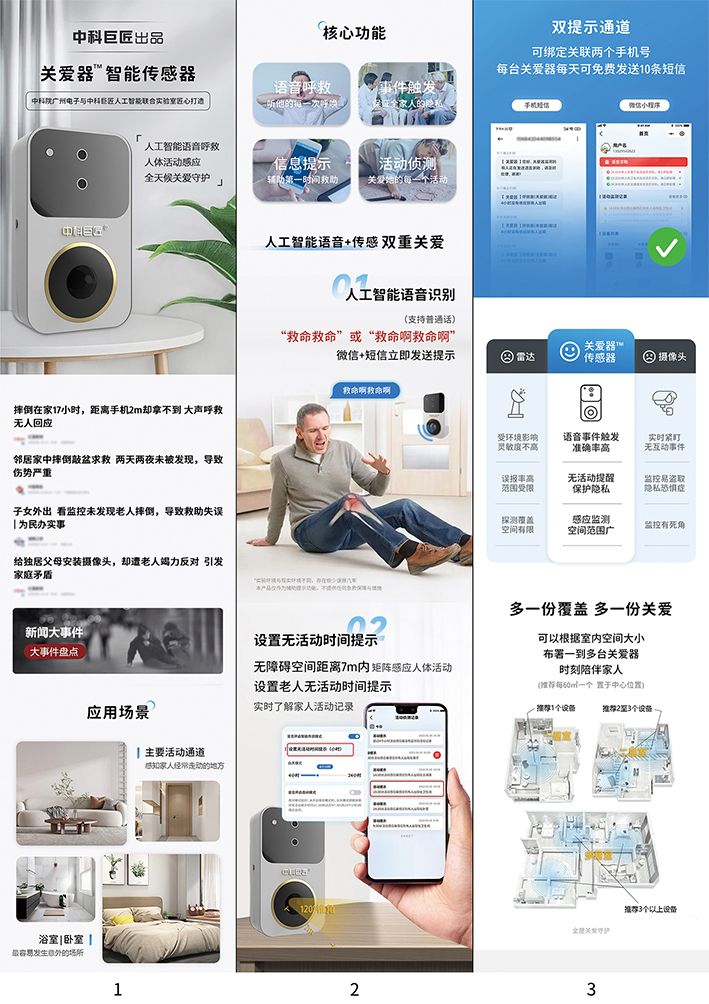 設(shè)備具備事件觸發(fā)準(zhǔn)確率高、無活動提醒保護(hù)隱私、感應(yīng)監(jiān)測空間范圍廣等優(yōu)勢 ,實(shí)現(xiàn)功能如下:智能緊急求助。如老人遇到緊急情況時,觸摸SOS求助按鈕(或呼喊救命救命),可第一時間收到小程序后臺或手機(jī)短信通知,協(xié)助救援;智能傳感矩陣技術(shù)。支持設(shè)置無活動時間提醒,在區(qū)域內(nèi)24小時時間段內(nèi)(可自定義時間)未感應(yīng)到人員通過,則向客戶端及后臺發(fā)出警報(bào),實(shí)時了解家人活動記錄;WIFI或內(nèi)置sim卡,方便與家人通訊。