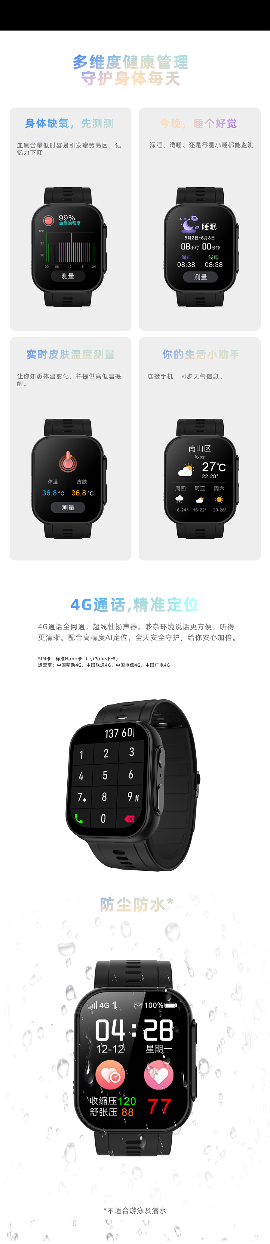 4G全網(wǎng)通,健康監(jiān)測(cè)(支持心率血壓血氧),多重定位(支持gps/wifi/lbs-可選),雙向通話,SOS緊急呼叫,歷史軌跡,電子圍欄,鬧鐘,吃藥提醒