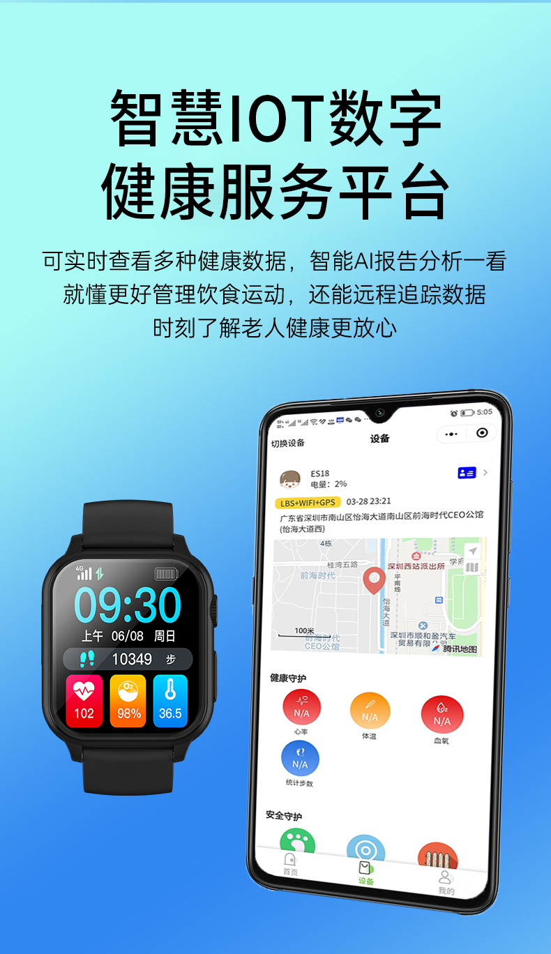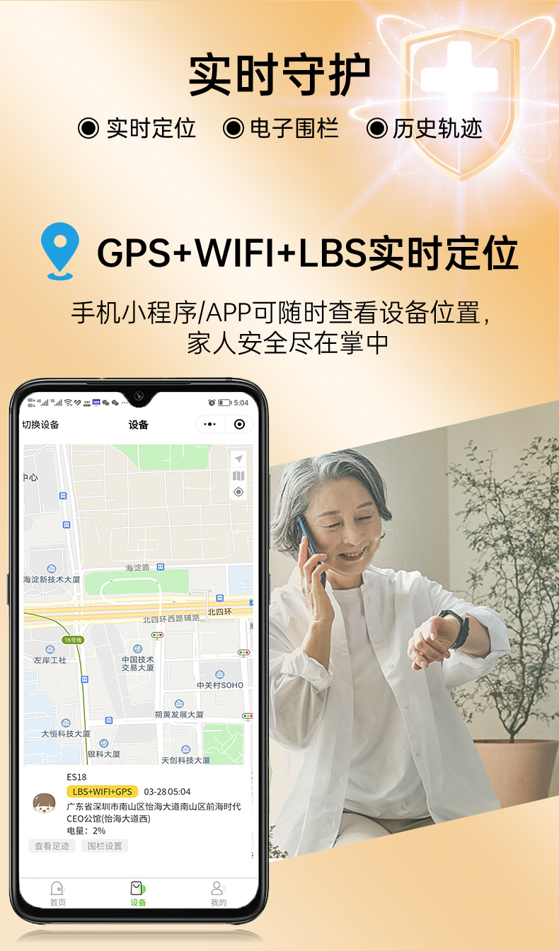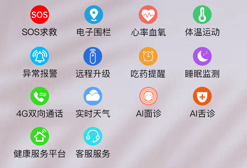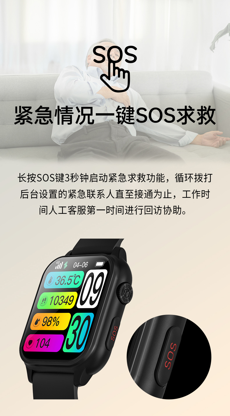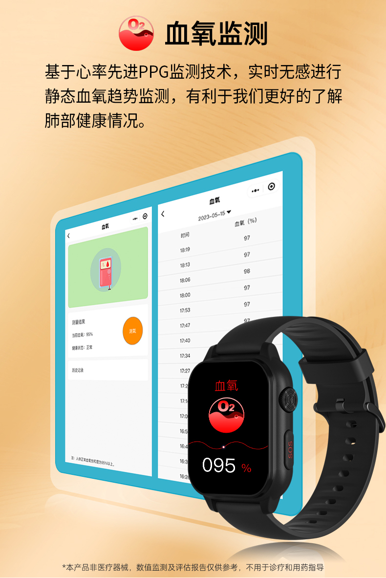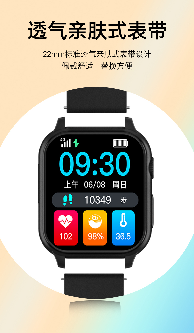 大屏顯示、精準(zhǔn)定位、電子圍欄、SOS報警、雙向通話、心率、血氧、體溫監(jiān)測、運動監(jiān)測
