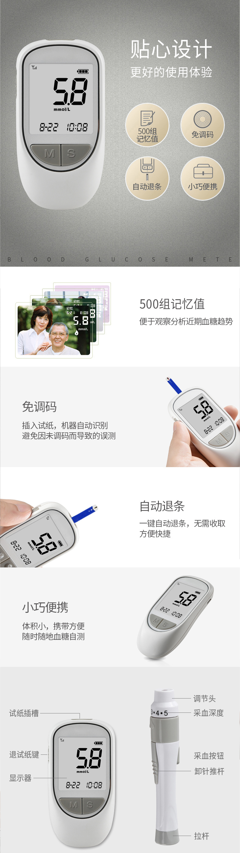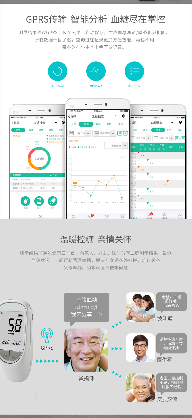 采血少、測速快 自動(dòng)分析測量結(jié)果 抗干擾、更準(zhǔn)確 云健康服務(wù) 免調(diào)碼、自動(dòng)退條 自動(dòng)存儲(chǔ)數(shù)據(jù) 趨勢分析健康總覽 數(shù)據(jù)同步手機(jī)家人