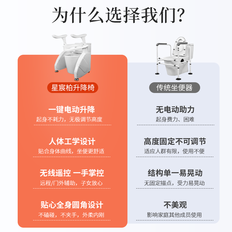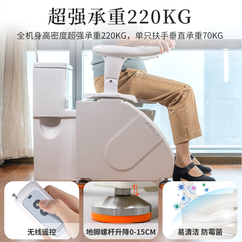 馬桶升降椅是行動不便人群的如廁輔助設(shè)備,主打電動一鍵升降,運行平穩(wěn)靜音,高度可調(diào)節(jié)以適配不同需求。采用人體工學設(shè)計,,承重可達200 公斤,安裝便捷無需改造衛(wèi)生間,防水材質(zhì)一擦即凈,適用于老人、術(shù)后患者及殘疾人,助其獨立如廁,降低跌倒風險。