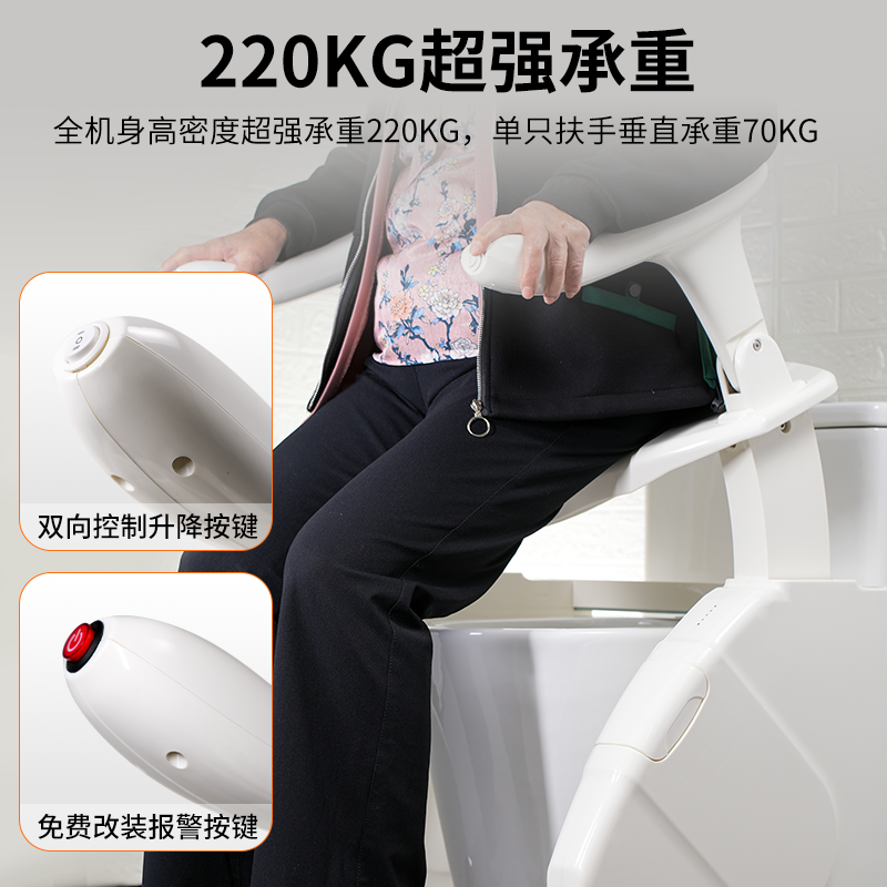 智能款馬桶升降椅融合升降輔助與智能清洗功能,專為行動(dòng)不便者設(shè)計(jì)。電動(dòng)一鍵升降,扶手可調(diào)節(jié),運(yùn)行平穩(wěn)靜音,承重達(dá) 200 公斤。配備溫水沖洗、暖風(fēng)烘干、智能除臭等衛(wèi)洗麗功能,無需手動(dòng)擦拭。帶防滑設(shè)計(jì)與一鍵呼救,360° 防水易清潔,安裝無需改造衛(wèi)生間,適用于老人、術(shù)后患者等,守護(hù)如廁安全與尊嚴(yán)