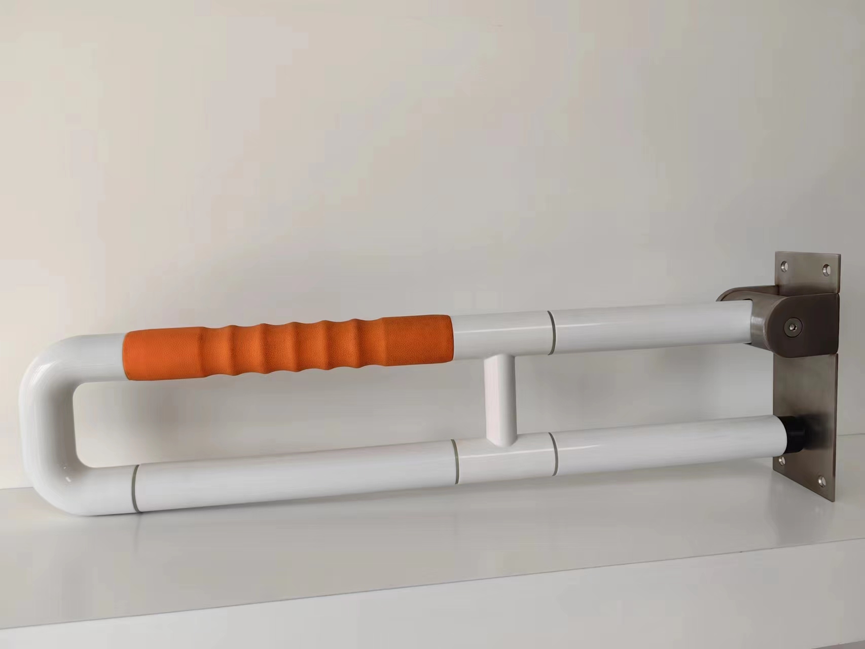 扶手可上翻,握桿外層為彈性TPE,外徑38mm,顏色藍(lán)白色或者黃白色,邵氏硬度為50度-60度;芯材為高強(qiáng)度鋁合金壁厚2mm, 6條內(nèi)加強(qiáng)筋,5條外加強(qiáng)筋;加強(qiáng)部分外層采用ABS尼龍料,內(nèi)管采用直徑28不銹鋼管,彎頭連接件采用ABS兩次注塑成型,握桿防轉(zhuǎn)動(dòng)、符合人體工學(xué)環(huán)狀凹凸握手紋設(shè)計(jì),皮紋表層,安全防滑,底板采用不銹鋼304材質(zhì)