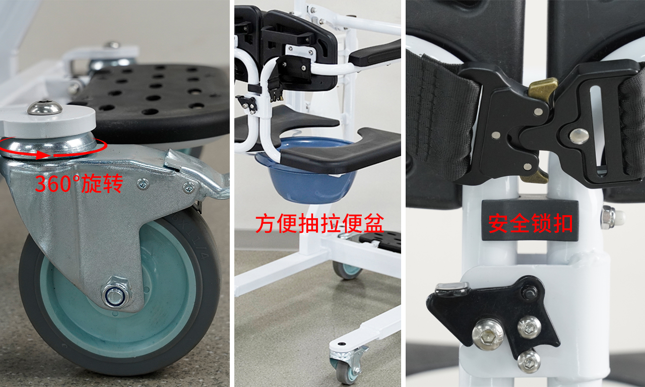 .全鋼結(jié)構(gòu)主體,承載能力強; 1,移位機電機位于一側(cè),兩腿中間沒有遮擋,乘坐更加舒適。 2..底盤結(jié)構(gòu)高度低,適配不同床; 3.座板帶卡扣和金屬安全卡扣的安全帶,雙重保險更安全; 4.可拆卸結(jié)構(gòu),減小包裝體積,方便運輸。 5.電機帶防水套,提升防水等級,防水效果更好。