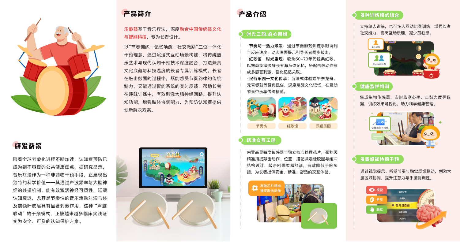 樂齡鼓基于音樂療法,深度融合中國傳統(tǒng)鼓文化與智能科技,專為長者設(shè)計。以“節(jié)奏訓練一記憶喚醒一社交激勵”三位一體化干預理念,通過沉浸式互動場景構(gòu)建,將傳統(tǒng)鼓樂藝術(shù)與現(xiàn)代認知干預技術(shù)深度融合,打造兼具文化底蘊與科技溫度的長者專屬訓練模式。長者在敲擊鼓面的過程中,既能感受節(jié)奏韻律的傳統(tǒng)魅力,又能通過智能系統(tǒng)的實時反饋,幫助長者在趣味訓練中,有效刺激大腦神經(jīng)回路、提升認知功能,增強肢體協(xié)調(diào)能力,為預防認知