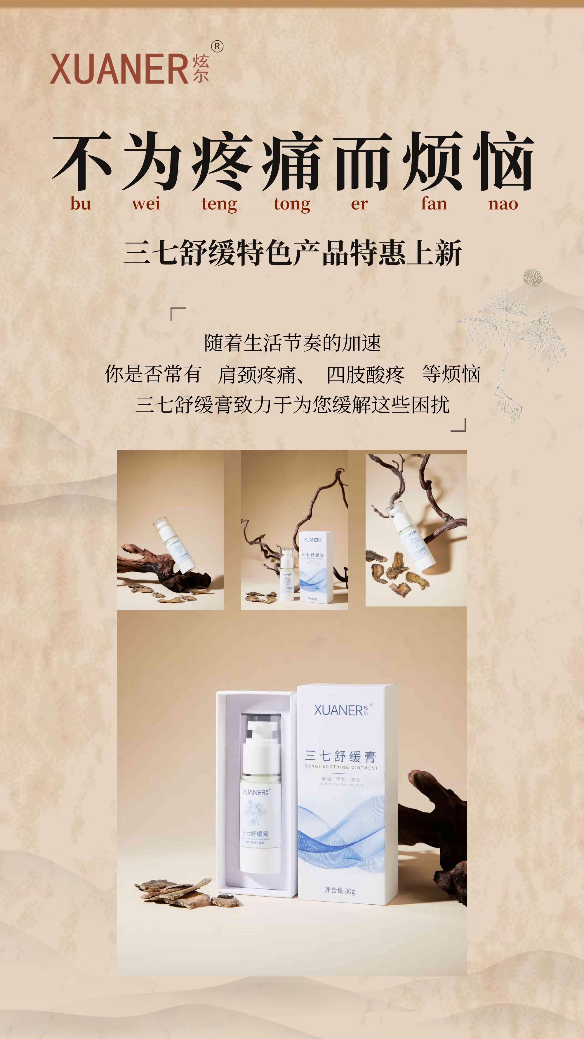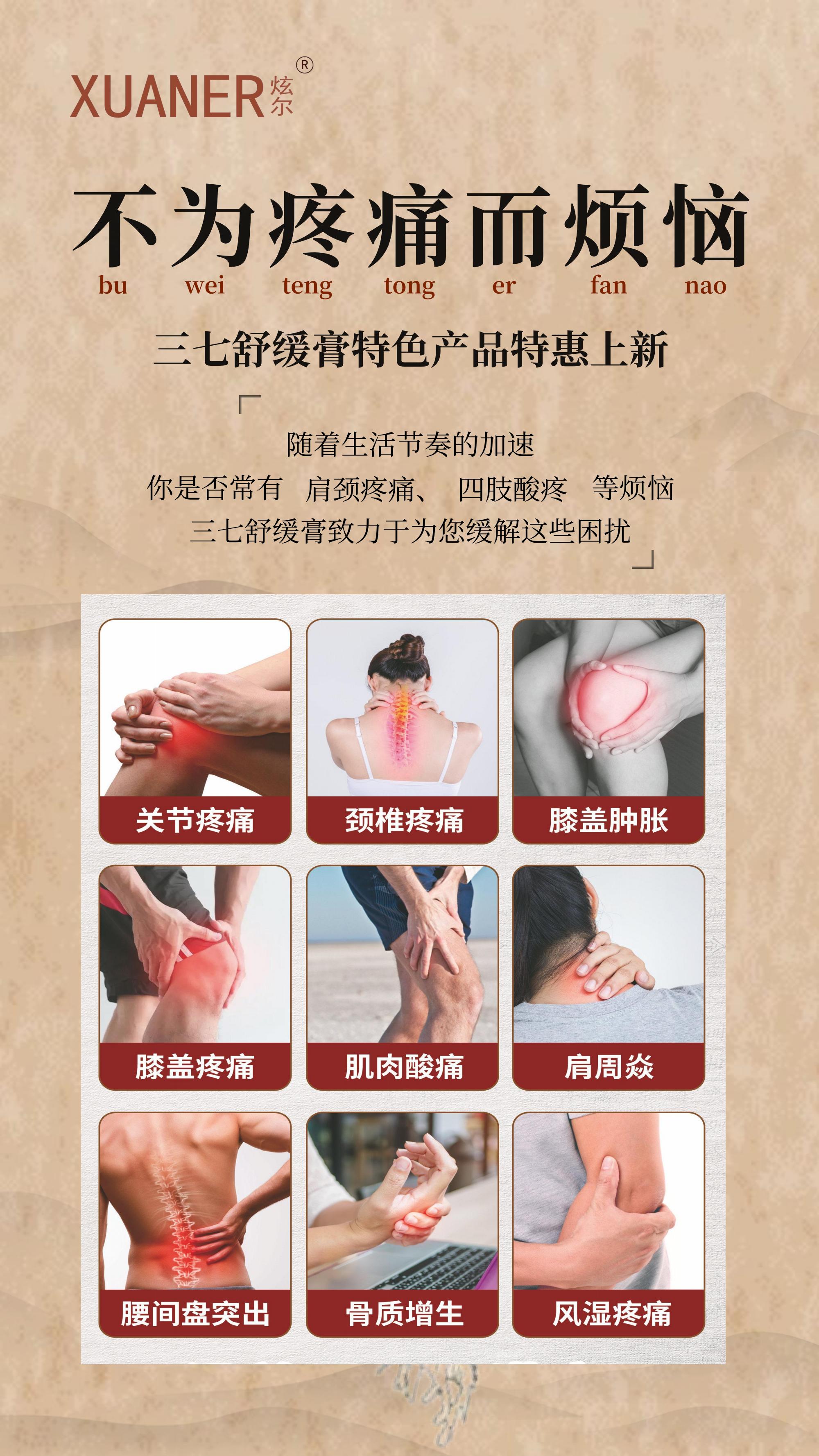 中科(廣州)生物醫(yī)學(xué)科技院運(yùn)用現(xiàn)代分子蒸餾、超聲提取、樹(shù)脂富集有效成分等方法,以中華民族先圣數(shù)千三七舒緩膏采用蒼術(shù)、沒(méi)藥、西洋接骨木、長(zhǎng)壽花、三七、天麻、姜黃、肉桂、薄荷、紅景天等 23 味中草藥為原料,利用植物皂甙和酚類(lèi)物質(zhì)與皮膚角蛋白化學(xué)反應(yīng)產(chǎn)生的放熱反應(yīng),快速、有效、無(wú)副作用的對(duì)疼痛部位進(jìn)行干預(yù),活血降粘、抑制痛感神經(jīng)傳導(dǎo)、提高痛閾,在短時(shí)間內(nèi)解除患者痛苦,消除痛感。