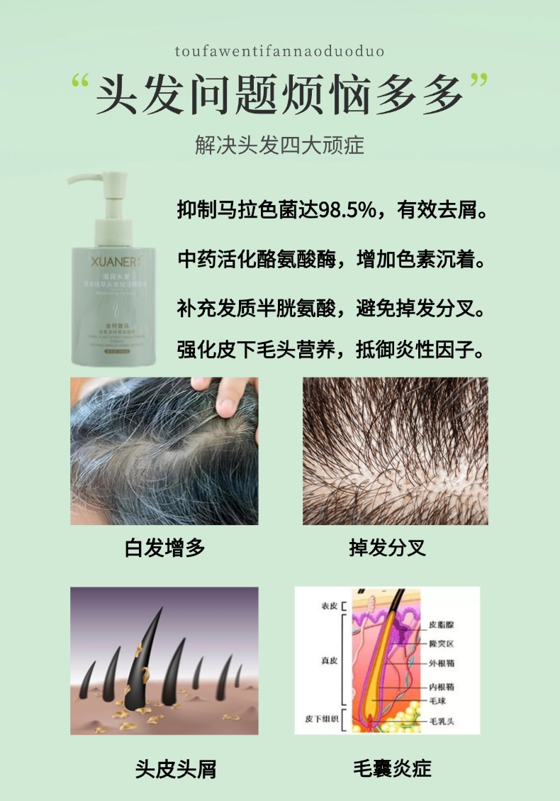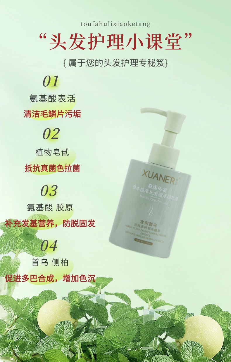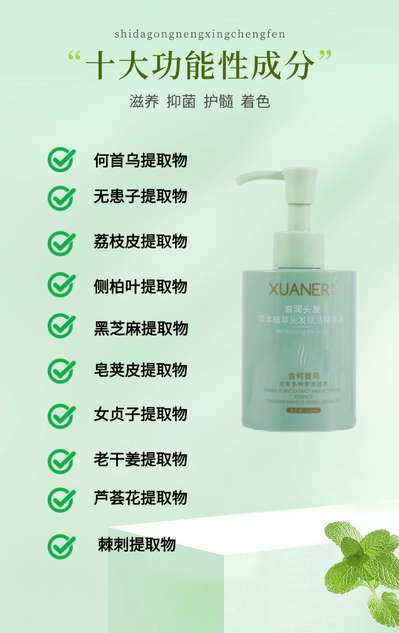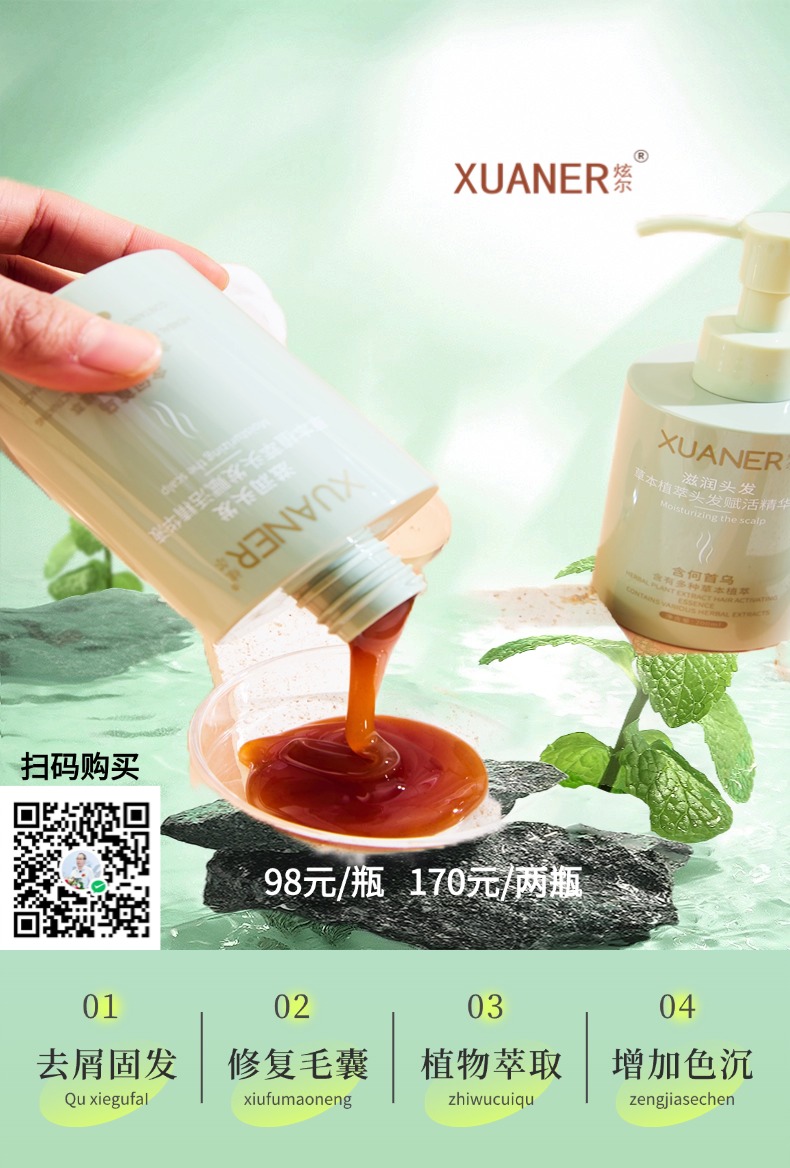 以側(cè)柏葉和何首烏為君藥,無患子、蛇床子等12味中草藥為臣藥,通過超聲提取、樹脂富集、真空濃縮等技術(shù)手段首創(chuàng)了“植物養(yǎng)發(fā)組合提取物”,應(yīng)用于烏發(fā)、生發(fā)制劑,效果明顯,無任何副作用,已經(jīng)在國家藥監(jiān)局備案,取得了純植物烏發(fā)國內(nèi)唯一組合“報送碼”,目前,已經(jīng)使用該原料生產(chǎn)出“植萃頭發(fā)賦活精華液”供應(yīng)市場。
