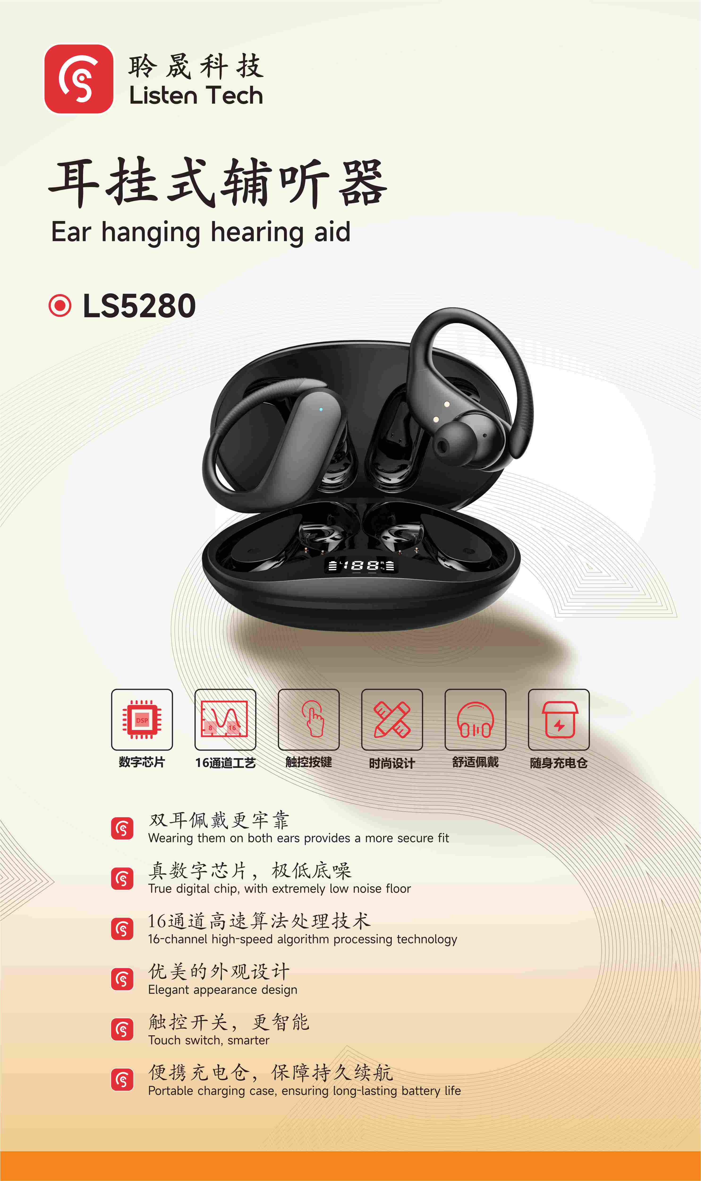 雙耳佩戴更牢靠 真數(shù)字芯片,極低底噪 16通道高速算法處理技術 優(yōu)美的外觀設計 觸控開關,更智能 便攜充電倉,保障持久續(xù)航
