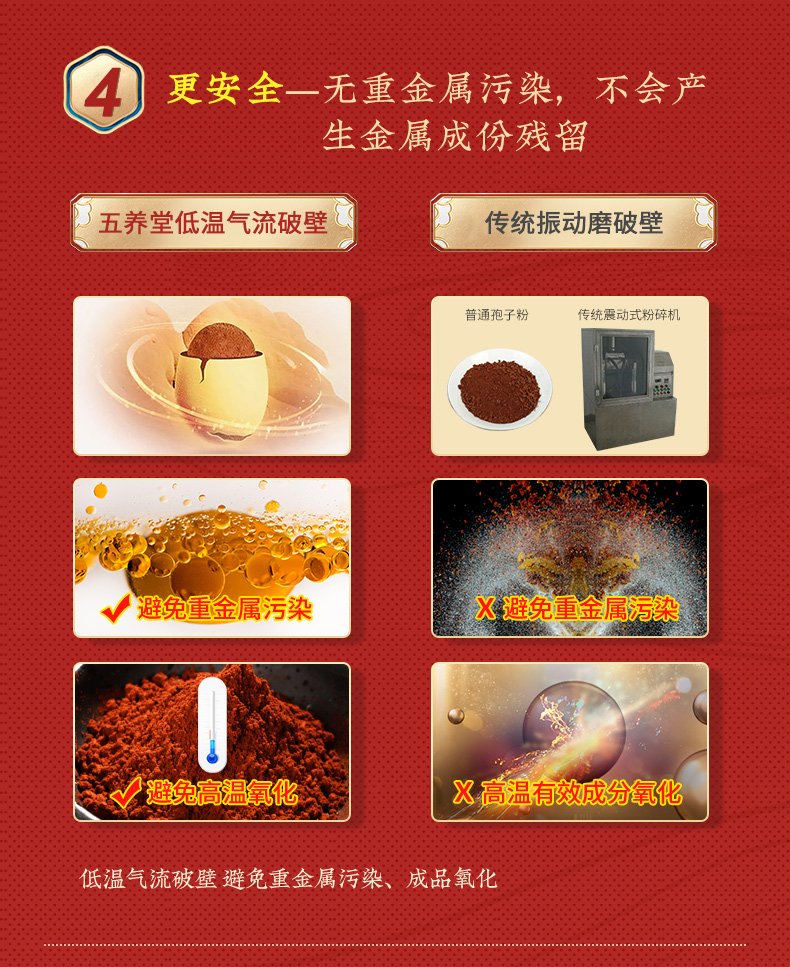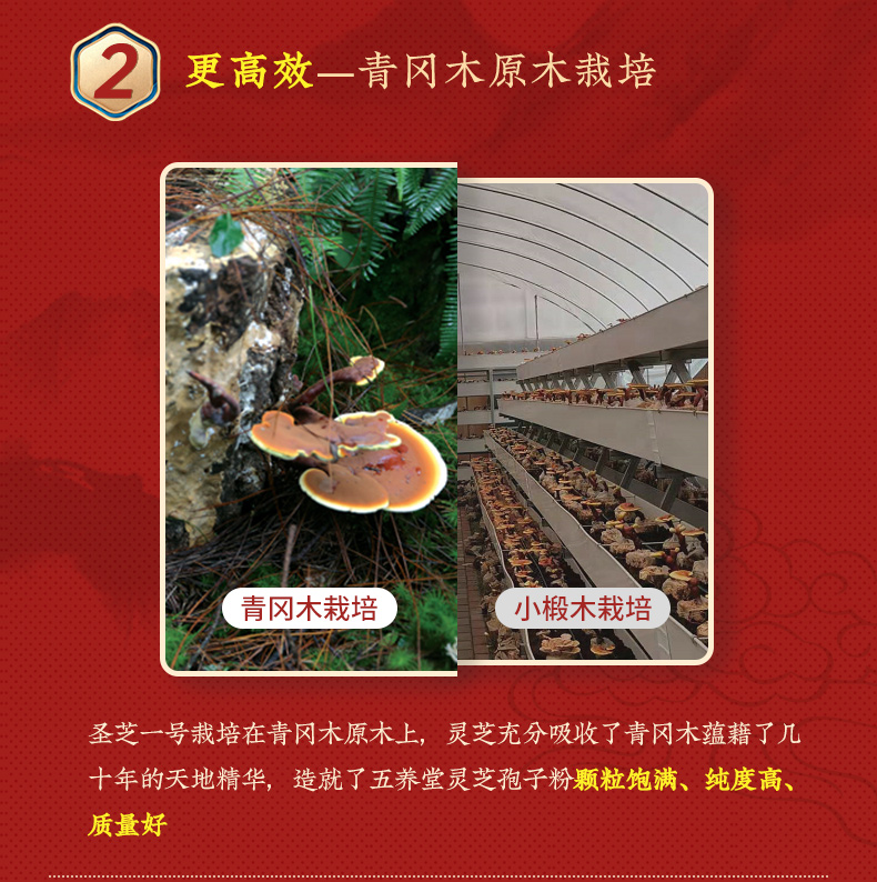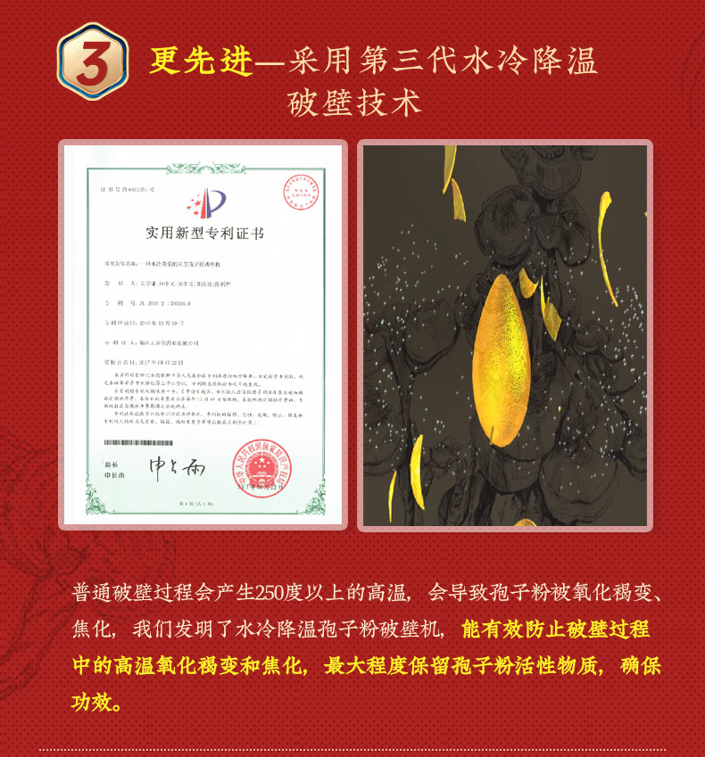 1.高山林下種植靈芝、仿野生壞境栽培,次生代謝物含量高,孢子粉飽滿,營養(yǎng)含量高。人種天養(yǎng),不施肥,不打農(nóng)藥,無農(nóng)藥殘留,無重金屬污染; 2.利用低溫水冷破壁技術(shù)(機(jī)械破壁易產(chǎn)生高溫,使得孢子粉內(nèi)成分氧化),更利于人體吸收; 3.百分百純的破壁靈芝孢子粉,無添加輔料,純粹的菁華。