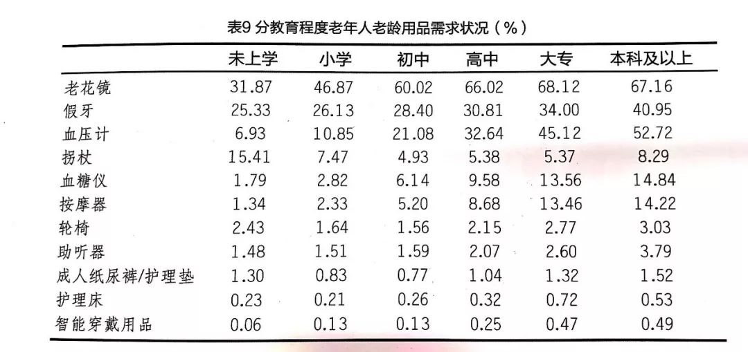 從受教育程度來看,除了拐杖,老年人對各種老齡用品的需求基本隨著受教育程度提高而增加,見表9。特別是對老花鏡、血壓計(jì)、血糖儀的需求變化明顯;未上學(xué)的老年人對拐杖需求最大,需求率達(dá)到15.41%,反映出受教育程度對老齡用品的選擇具有直接影響。
