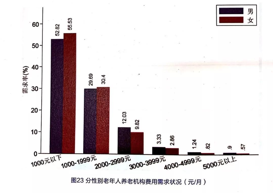 從不同性別來看,男性老年人和女性老年人對養(yǎng)老服務(wù)機(jī)構(gòu)費(fèi)用的需求率基本相同。養(yǎng)老服務(wù)機(jī)構(gòu)費(fèi)用在2000元以下/月時(shí),女性需求率略高于男性;在2000元/月以上時(shí),男性需求率略高于女性,見圖23。