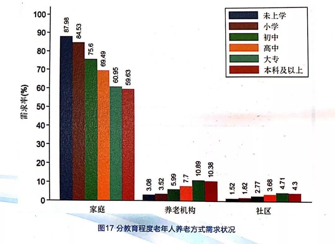 從受教育程度來看,老年人對家庭養(yǎng)老的需求意愿隨著受教育程度提高而減弱。在家庭養(yǎng)老的需求意愿方面,未上學(xué)的老年人需求率最高,為87.98%;本科及以上的老年人需求率最低,為59.63%,見圖17。另外,老年人對養(yǎng)老機(jī)構(gòu)和社區(qū)養(yǎng)老的需求意愿隨著受教育程度提高而增強(qiáng)。