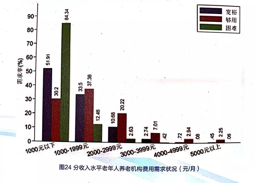 從收入水平來看,養(yǎng)老服務(wù)機(jī)構(gòu)費(fèi)用在2000元/月和1000元/月以下時(shí),困難老年人的需求率分別為96.80%和84.34%,見圖24??傮w來看,在費(fèi)用2000元/月以上時(shí),收入夠用的老年人可以承受的比例更高,反映出收入較好的老年人可以承受的養(yǎng)老服務(wù)機(jī)構(gòu)費(fèi)用也相對較高。