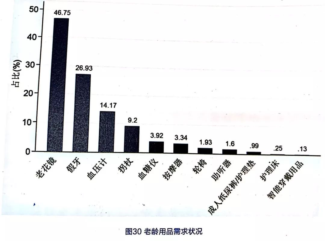 在我國老齡用品需求中,老花鏡、假牙和血壓計(jì)位于前三位,需求率均超過了10%。從圖30可以看出,需求最大的是老花鏡,需求率為46.75%;其次是假牙,需求率為26.93%;第三位是血壓計(jì),需求率為14.17%;拐杖、血糖儀與按摩器的需求率分別為9.2%、3.92%和3.34%;其他輔助用品,如輪椅、助聽器、成人紙尿褲/護(hù)理墊、護(hù)理床與智能穿戴用品,需求率均在2%以下。