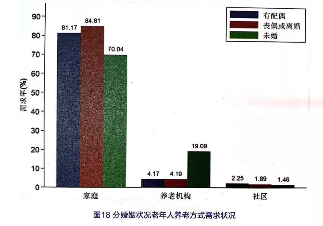 從婚姻狀況來看,喪偶或離婚老年人對家庭養(yǎng)老的需求意愿最強(qiáng),未婚老年人對家庭養(yǎng)老的需求意愿最低,兩者的需求率相差14.77%。未婚老年人對機(jī)構(gòu)養(yǎng)老的需求意愿最強(qiáng),為19.09%,見圖18。