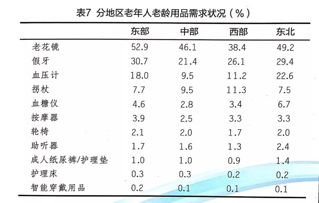 從不同地區(qū)來看,老花鏡、假牙和血壓計(jì)是老年人需求量較大的老齡用品。在老花鏡、假牙、按摩器、輪椅、護(hù)理床、智能穿戴用品等方面,東部地區(qū)老年人的需求比例明顯高于其他地區(qū),分別為52.9%、30.7%、3.9%、2.1%、0.3和0.2%;在老花鏡、血壓計(jì)、血糖儀、助聽器和成人紙尿褲等方面,東北地區(qū)老年人的需求比例明顯高于其他地區(qū),分別為49.2%、22.6%、6.7%、2.4%和1.4%;在拐杖方面,西部地區(qū)老年人的需求比例最高,為11.3%,見表7。