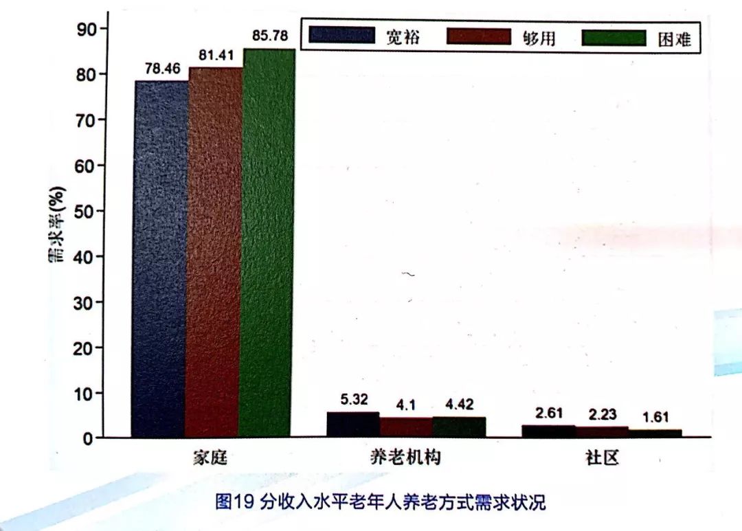 從收入水平來看,收入寬裕、夠用和困難的老年人對家庭養(yǎng)老需求意愿均較高,需求率分別為78.46% 、81.41%和85.78%;社區(qū)養(yǎng)老需求意愿均較低,需求率分別為2.61%、2.23%和1.61%;收入夠用老年人對機(jī)構(gòu)養(yǎng)老的需求意愿最低,見圖19。