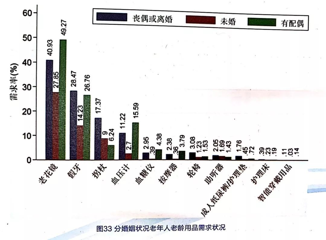 從婚姻狀況來看,有配偶的老年人對老花鏡、血壓計(jì)、血糖儀和按摩器的需求高于其他老年人;喪偶或離婚的老年人對拐杖、輪椅、成人紙尿褲/護(hù)理墊的需求高于其他老年人,反映出身體健康狀況相對較差;未婚的老年人對各項(xiàng)老齡用品的需求均低于其他老年人,見圖33。