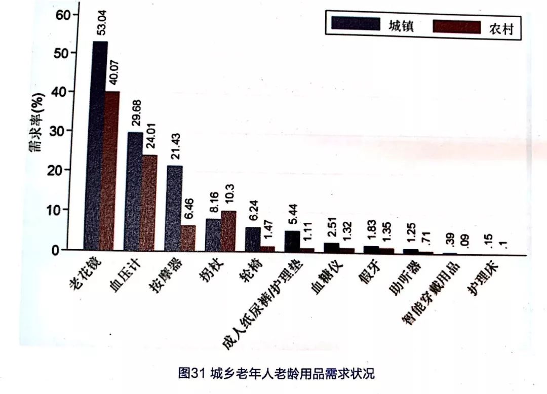從圖31可以看出,除拐杖外,城市老年人對各種老齡用品的需求均高于農(nóng)村老年人,特別是按摩器、輪椅與成人紙尿褲/護(hù)理墊,分別為3.32倍、4.24倍和4.9倍,但農(nóng)村老年人對于拐杖的需求高于城市老年人。由此可見,農(nóng)村老年人對老齡用品的需求意愿普遍不強(qiáng),行動不便的老年人多選擇依靠拐杖出行。