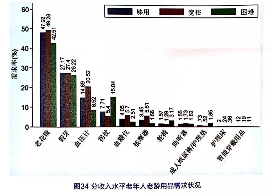 本部分以“第四次抽樣調(diào)查”中對老年人生活輔助用品的調(diào)查數(shù)據(jù)為基礎(chǔ),選取使用范圍廣、實(shí)際需求大、年齡特征明顯的老齡用品類型,重點(diǎn)分析了老花鏡、假牙、助聽器、血壓計(jì)、血糖儀、拐杖、按摩器、護(hù)理墊、護(hù)理床、輪椅、智能穿戴用品等老年照顧和護(hù)理輔具、老年行動輔具、老年溝通與信息輔具的需求狀況,從不同維度分析了老年人的需求狀況和差異。
