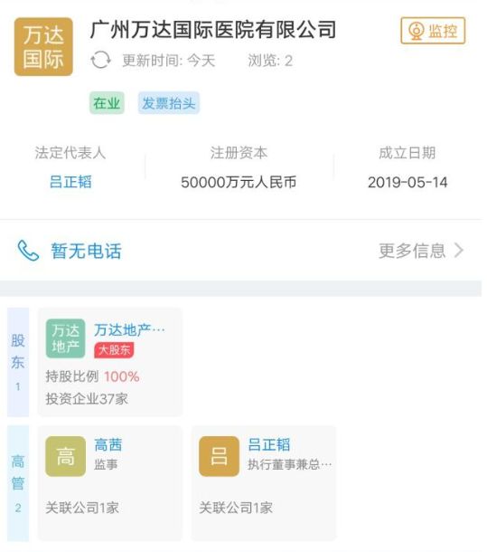 阿沐通過查詢相關(guān)信息發(fā)現(xiàn),就在6天前,也就是5月14日,萬達(dá)地產(chǎn)集團(tuán)有限公司新增對外投資,成立全資子公司廣州萬達(dá)國際醫(yī)院有限公司,注冊資本5億元人民幣,法定代表人為呂正韜,實(shí)際控制人以及最終受益人為王健林,持股比例98%,經(jīng)營范圍為: