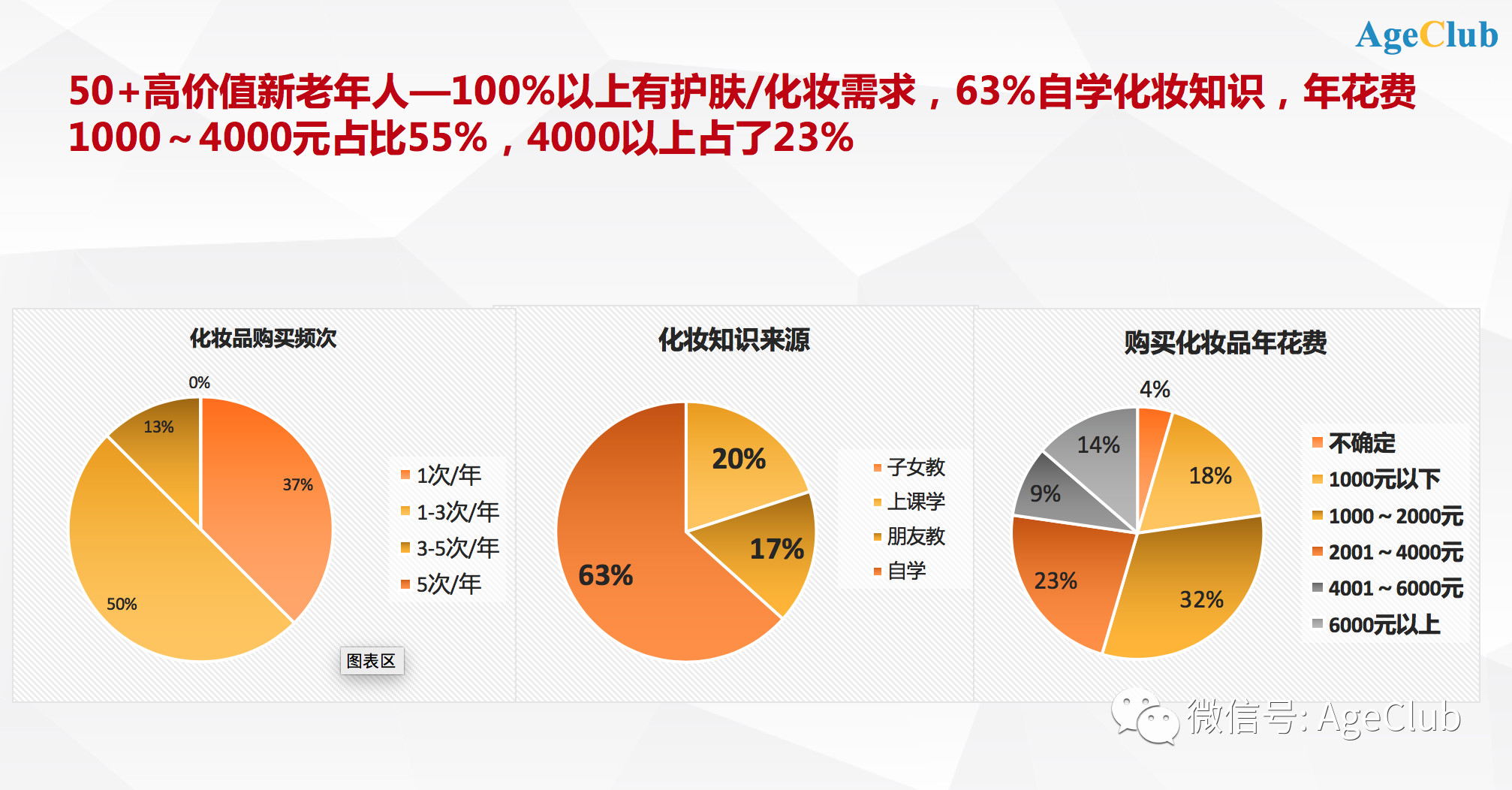 上個月,AgeClub在北京找了100位50-70歲之間的活力新老年人,對這些高價值新老年人的生活消費(fèi)方式進(jìn)行了深度調(diào)研,在調(diào)研中發(fā)現(xiàn),北京50+中老年人群100%都會護(hù)膚化妝,其中年均購買化妝品1~3次的中老年占比50%,3次以上占13%,從我們調(diào)研結(jié)果來看,市場需求潛力巨大。
