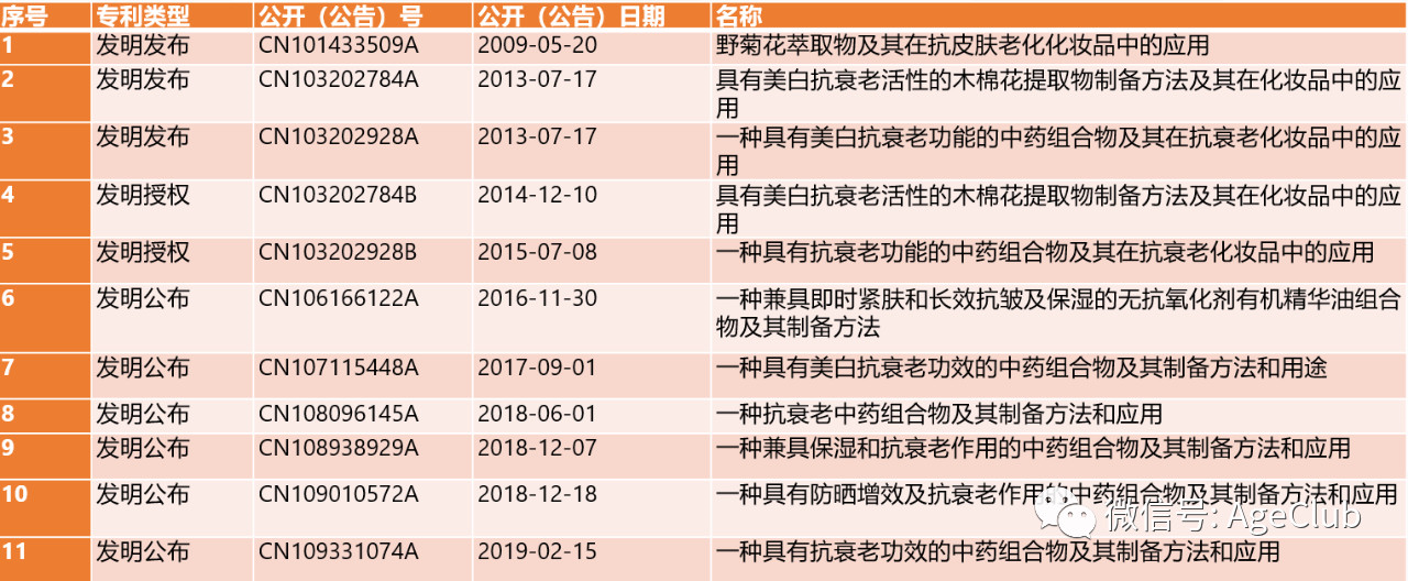 其實(shí)以美膚寶的專利技術(shù)實(shí)力,在中老年化妝品市場或許還將有更大的發(fā)展空間。查詢美膚寶的專利信息,發(fā)現(xiàn)其在中老年抗皺抗衰老方面已有不少積累,2009年至今,共有11項(xiàng)發(fā)明專利。