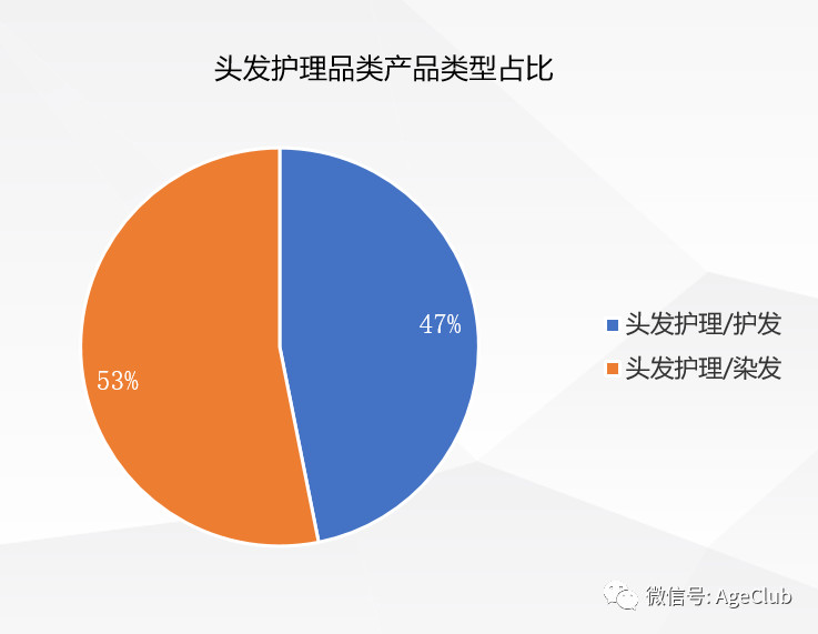 中老年化妝品另一個大品類頭發(fā)護(hù)理,專門解決中老年常見的白發(fā)問題。從白發(fā)變黑的功能性從弱到強(qiáng)劃分,主要分為5種產(chǎn)品類型:精華液、洗發(fā)水(護(hù)發(fā)型)、洗發(fā)水(染發(fā)型)、養(yǎng)發(fā)粉、染發(fā)劑。其中護(hù)發(fā)型產(chǎn)品的銷售額占比為47%,染發(fā)型產(chǎn)品的銷售額占比為53%。